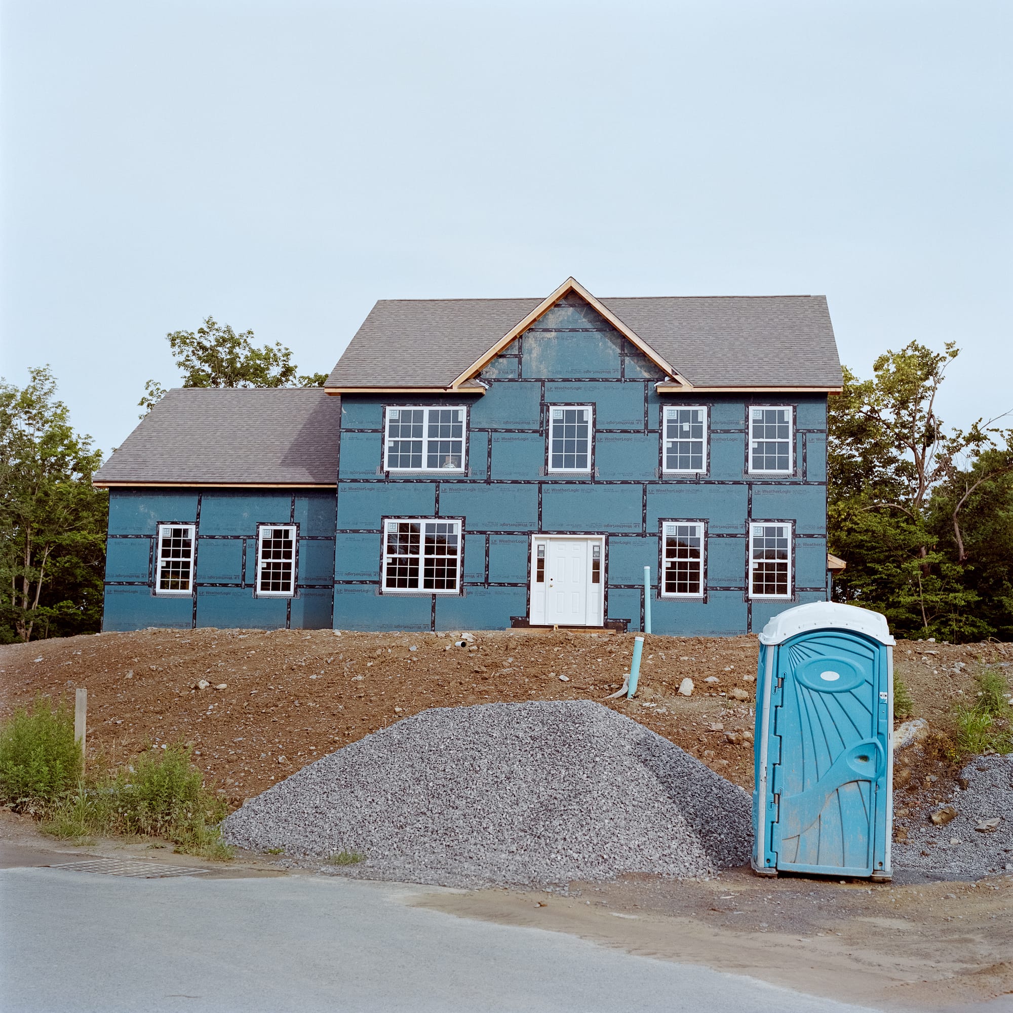 Hudson Valley Artists 2026: Terrestrial Extra is another rousing example of the Dorsky’s cerebral shows. Focused on the materiality of Mother Earth’s industrial materials, the show features mixed-media works by 18 Hudson Valley artists. Charlotte Schulz’s “Glass Drawing Collage #5” (2023) is a mechanical-looking charcoal drawing that hides a curious domestic scene within it, while Dan Devine’s sculpture “Tumble” (2025) consists of a leather figure suspended in a steel armature — a contemporary take on the Hanged Man tarot card archetype. Corinne Beardsley transports us to a futuristic beach with the shapely mash-up of crushed rocks, glass, and sand in “Cookie” (2025). Meanwhile, “Houses” (2022) by John Raugalis is a deadpan image of a blue porta-potty set against a blue-covered house under construction, a provocative vision of suburban blahness.