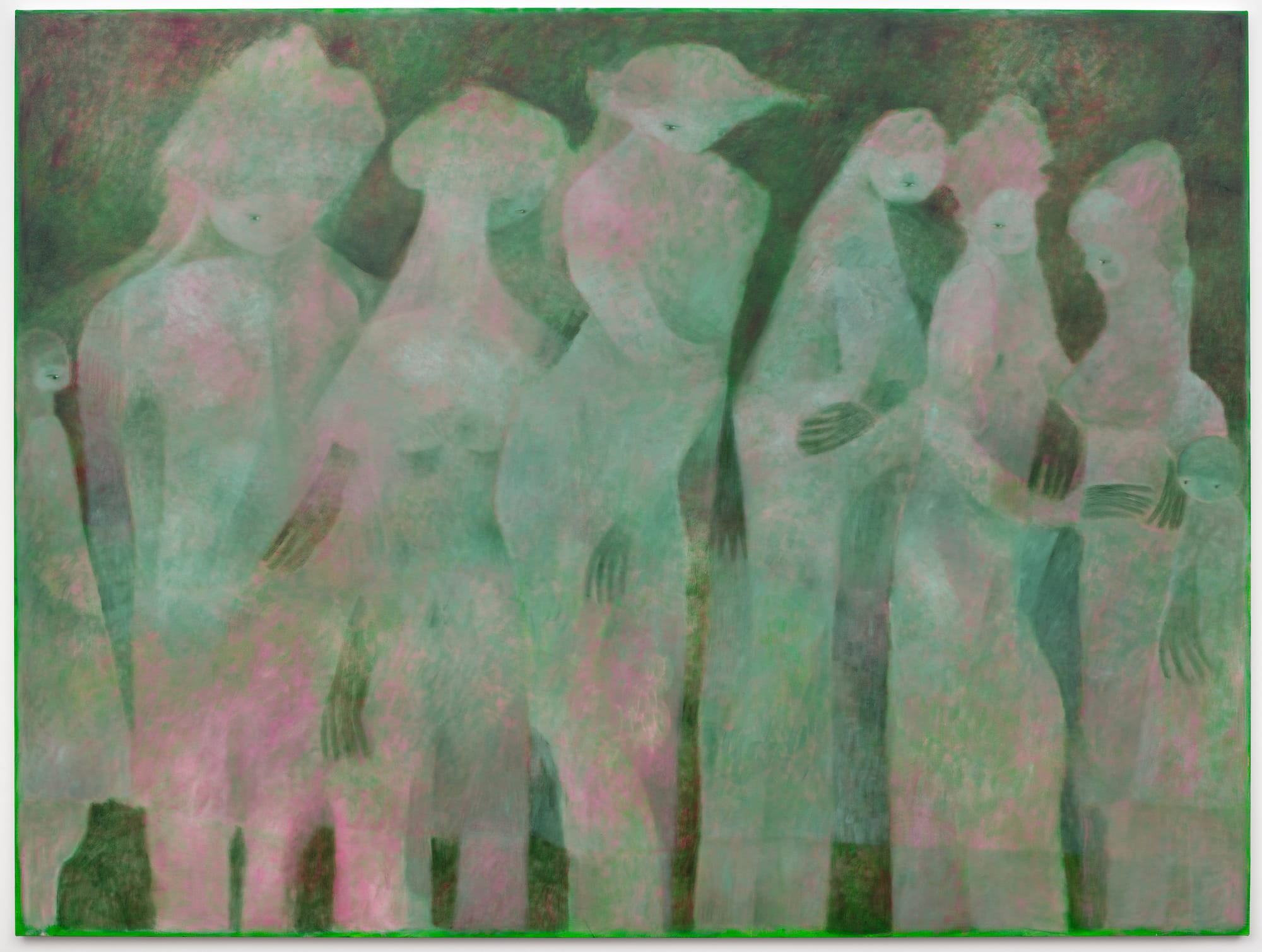 The enigmatic figures in Tahnee Lonsdale’s dreamy canvases hover between corporeal dissolution and apparition, as they emerge from layers of oil paint washes before fading back into them. Her stylized female forms recall modernist predecessors such as Paul Klee, while offering contemporary takes on 20th-century existential questions. The 13 richly colored paintings in this show depict groups of women arranged in shallow, frieze-like compositions that resonate on both formal and mystical levels.