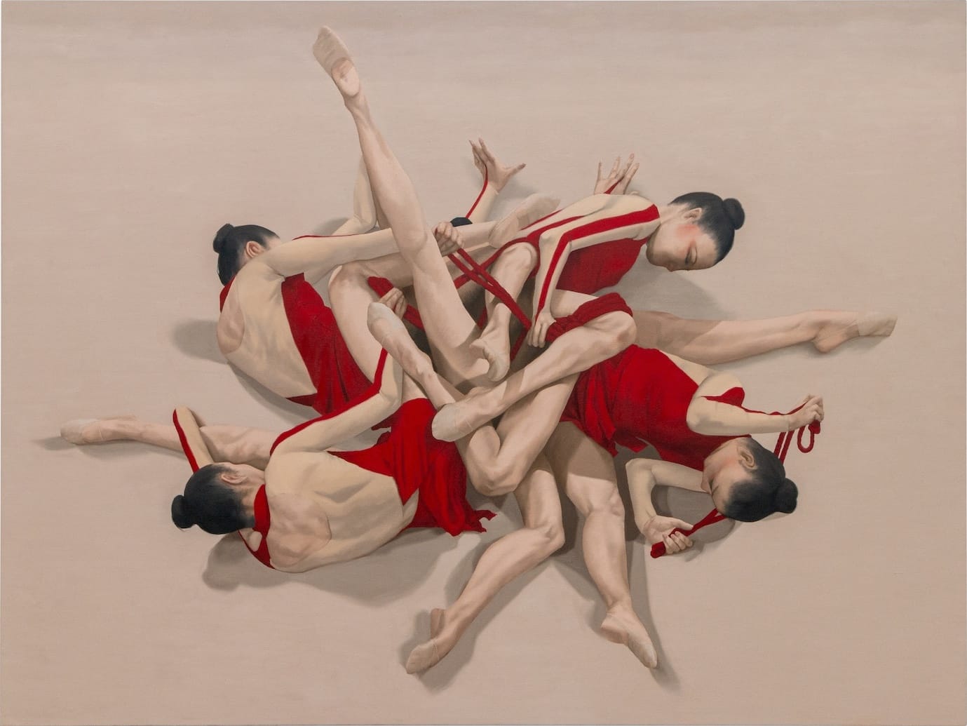 Rachael Bos's detailed oil paintings of Olympic athletes are characterized by a dry, obsessive focus on surface, form, texture, and pose, rather than on the pomp and glory of the games. In “Feedbacker No. 2” (2024), anonymous gymnasts in gray leotards create a swirling star shape with their arched bodies. Even when the Chicago-based painter chooses well-known subjects, as with a canvas named for Romanian gymnast Nadia Comăneci, it is not athletic prowess that is highlighted. Bos instead crops the image just above the competitor's nose, pulling our attention toward the clash between her brown shoes and bright red tracksuit, and the way she nervously wrings her hands.