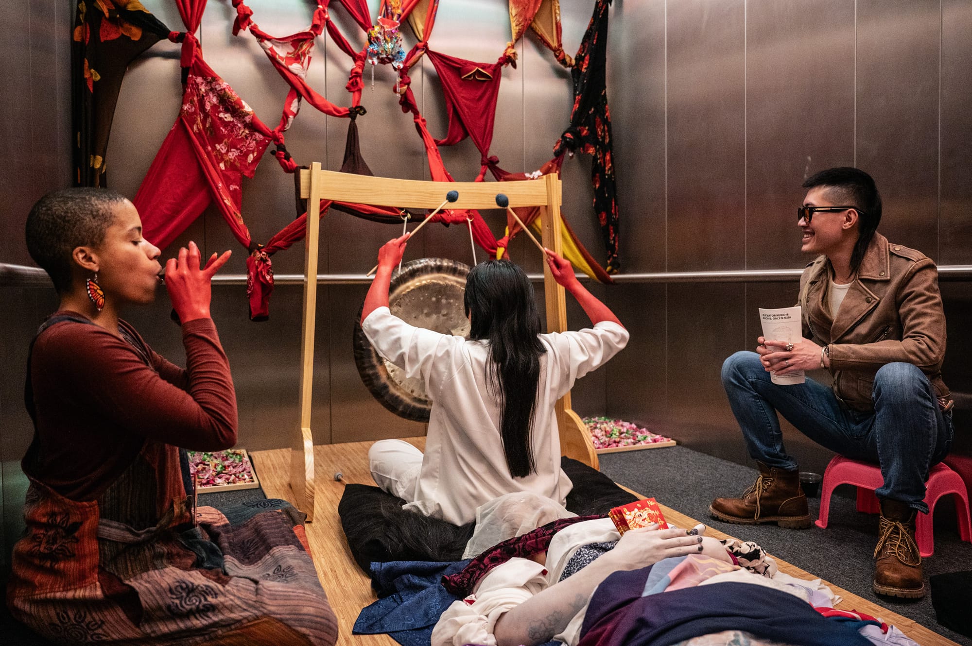 Elevator Music 48: Alone, only in flesh is the 48th installation in the ongoing “Elevator Music” series at the Tang Teaching Museum and Art Gallery at Skidmore College. This three-person exhibition explores diasporic experiences by way of a site-specific, collaborative installation housed inside an elevator. The multidisciplinary artists Antonius-Tín Bui, Theresa-Xuan Bui, and MIZU consider the cherished connections between land and water and the ever-shifting issues of (personal) homeland and (political) identity. During the opening celebration for this show, the artists took part in a performance that included an elaborate altar adorned with incense, colorful Asian cloths, and candy. Alone, only in flesh welcomes visitors to commune with the unknown and immerse themselves in this bountiful installation.