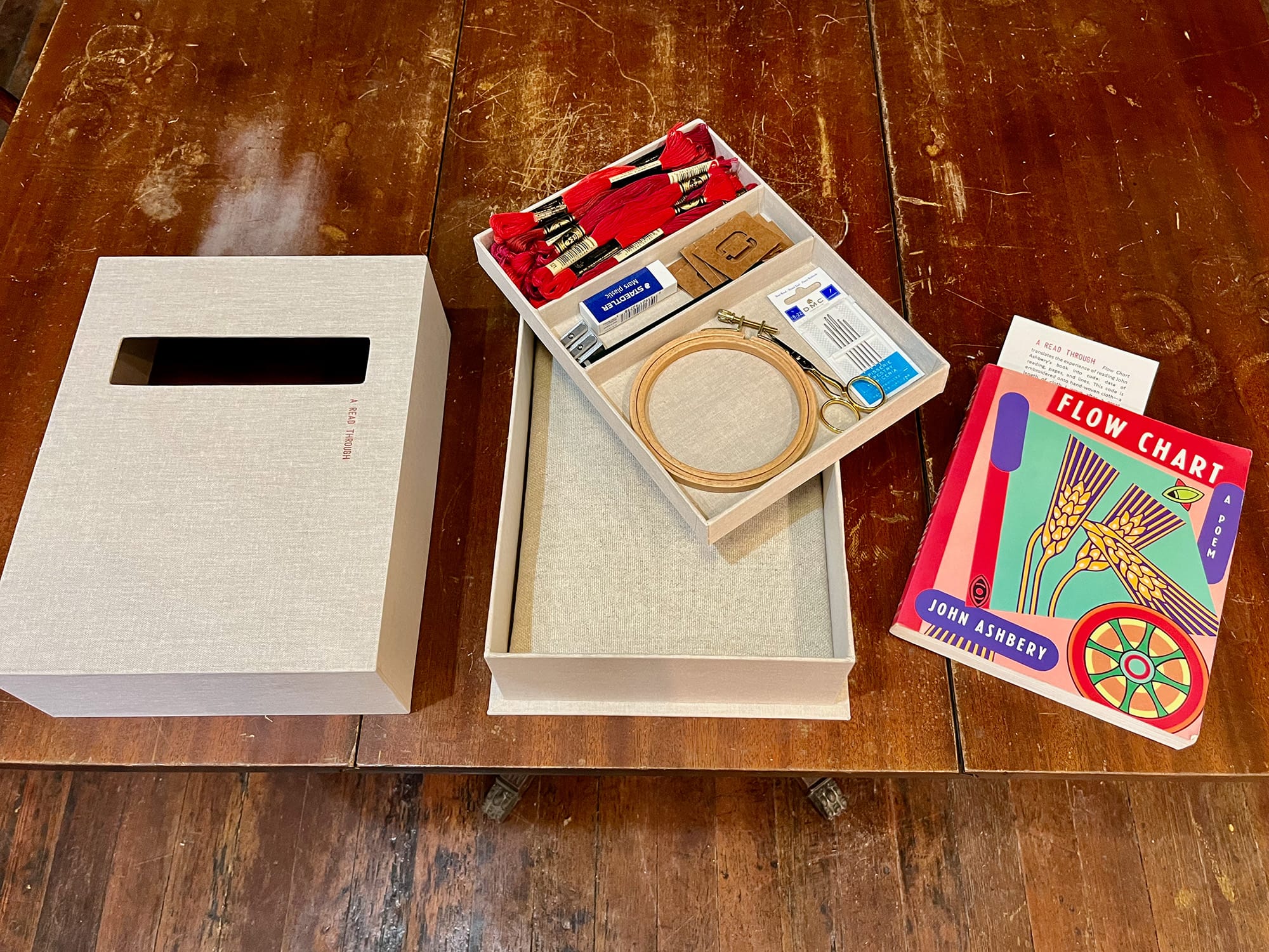 Referencing a line from her own poetry, the exhibition "if recopying is to author" at the Flow Chart Foundation in Hudson presents a series of textile works by poet, artist, and educator Jill Magi. With “textility” as her muse, Magi explores her affinity for poetry through a sequence of paintings, embroideries, hand-weavings, and handmade books. To make these works, Magi copied and recopied text onto their surfaces to play with meaning and materiality. Her installation “that of January —” (2023) includes nine monumental drop cloths infused with words and citations that hang dramatically to the floor. During the run of this exhibition, Magi will preside over the space on Saturdays to continue copying and recopying texts onto a large piece of muslin, thereby creating a new fabric work that includes the poetry and texts of others, notably John Ashbery.