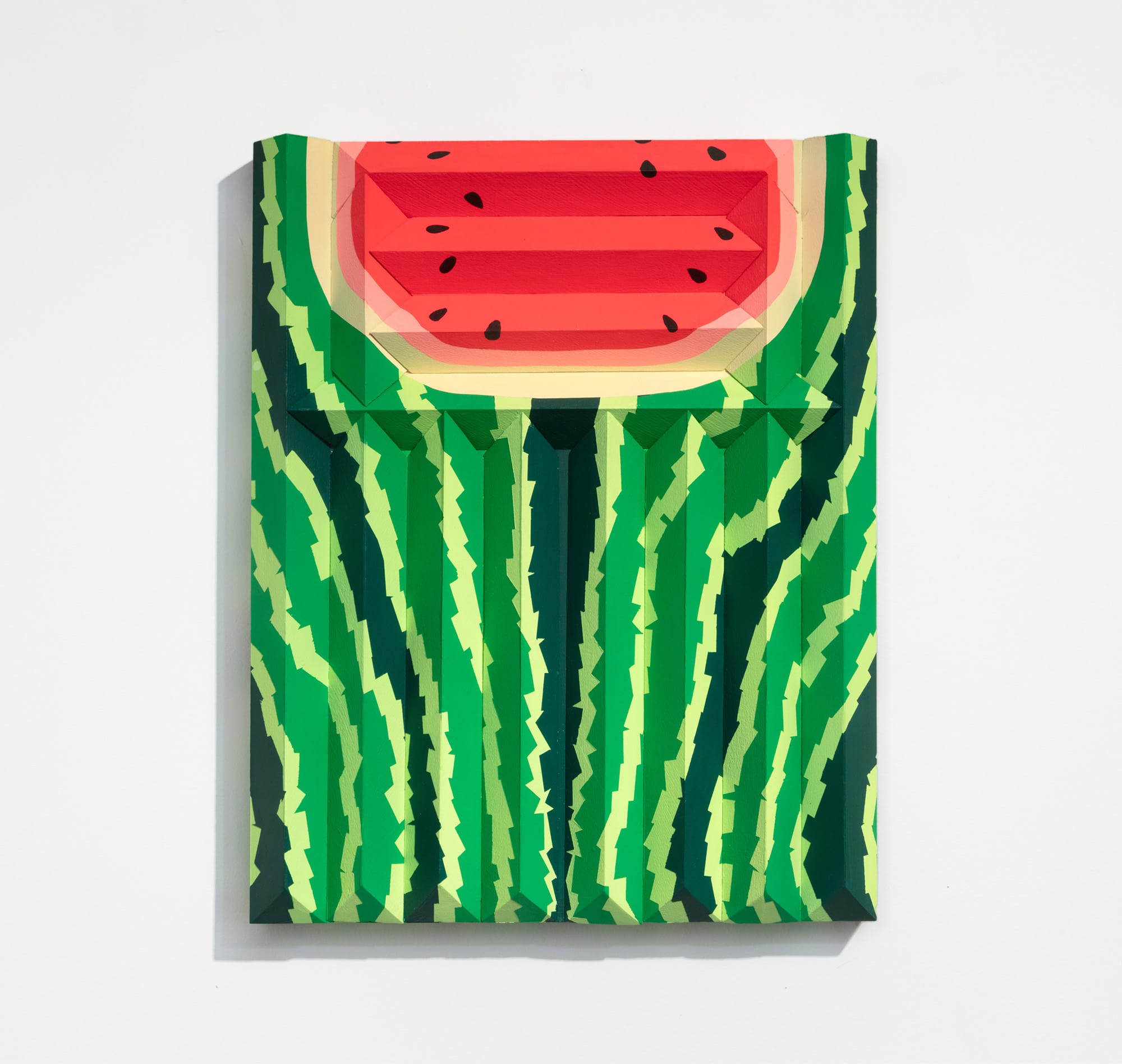 As a Palestinian growing up in the rural Midwest, multi-media artist Michael Hambouz experienced disparity and imbalance throughout his youth, a sense of alienation compounded by his father’s haunting PTSD from time spent at refugee camps in Ramallah and his family’s brutal experiences of wartime horrors. Hambouz’s first solo show, Loves Cats, Hates Catastrophes at Elijah Wheat Showroom in Newburgh, presents a series of bright, boldly geometric relief paintings that tease out themes of generational trauma, personal reflection, and symbolic transformation. Hambouz’s works seem to be moving: Three-dimensional elements in works such as “Current Mood” (2002) invite us into a maze-like form of varied vantage points. The acute craftmanship, directness of form, and architectural aspect of Hambouz’s practice discloses a clarity of vision.