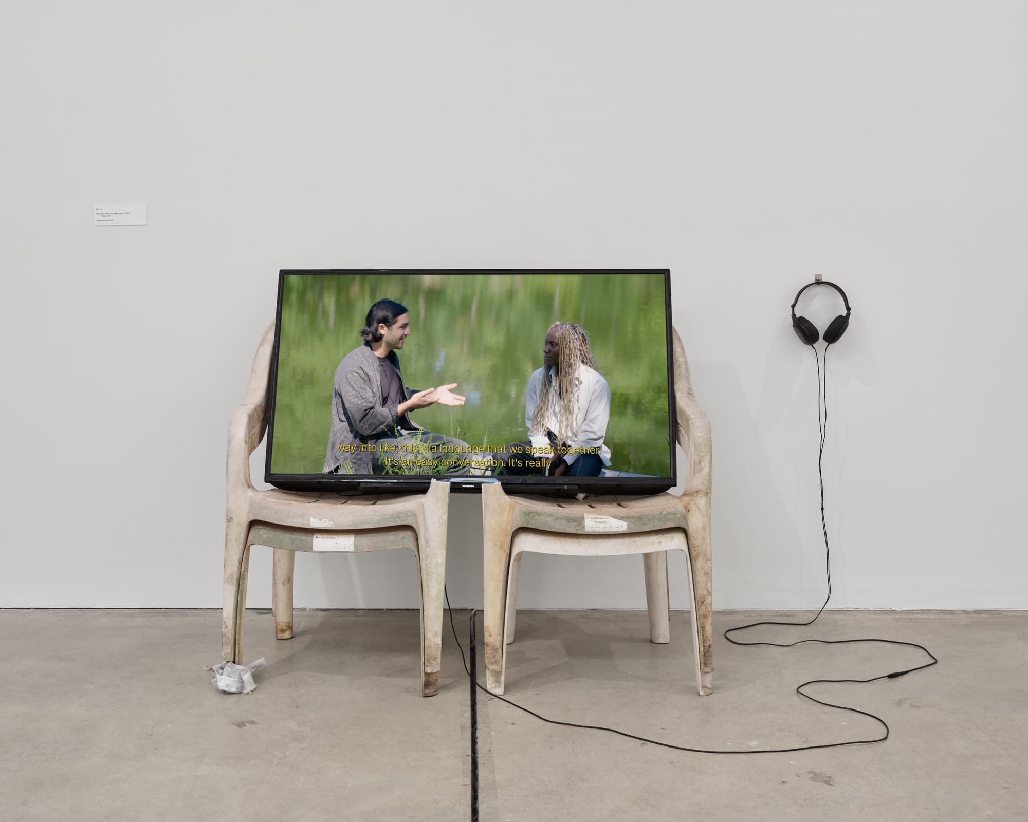 Combining aspects of music, performance, sculpture, and sound art, the Sierra Leonean-American artist’s experimental installation Iron + Palm Wine features video, sound, and digital collage, showcasing their ongoing explorations of West African finger-picking blended with looped vocals and storytelling. One area of the show includes a sculptural scene of a TV screen positioned on lawn chairs with a headset to listen to interviews conducted by Yatta. Other elements include poetic phrases on the walls; statements such as “the black wanderer is a mode of being” offer a cerebral dimension to this dynamic show.