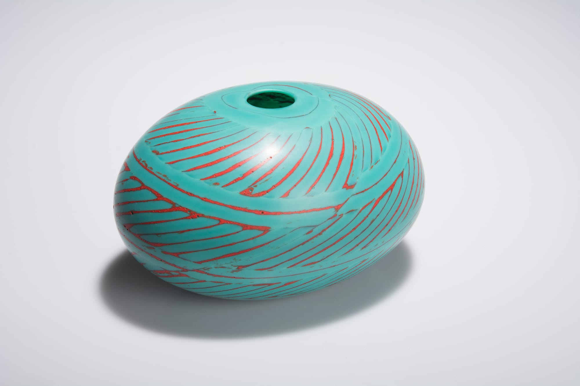 Yoichi Ohira’s exquisite vessels are a charming vision of the magical potential of glass. Japan in Murano, curated by Nicola Lucchi at Magazzino Italian Art, celebrates his masterful engagement with this atypical medium during his nearly 40-year career in Murano through a troupe of candy-colored delights in the form of more than 60 glass works. “Gocce di cristallo” (1999) is a stout jar patterned with small dazzling squares, while “Grappolo in rosso e in nero” (2001) is a balloon-shaped piece with compelling red, black, and white coloring. “Finestre” (1997) shines brightly in pure azure, and “Mille luci” (2002) is among the most elegant works in the show, glowing brightly in its perfect translucent teardrop shape.