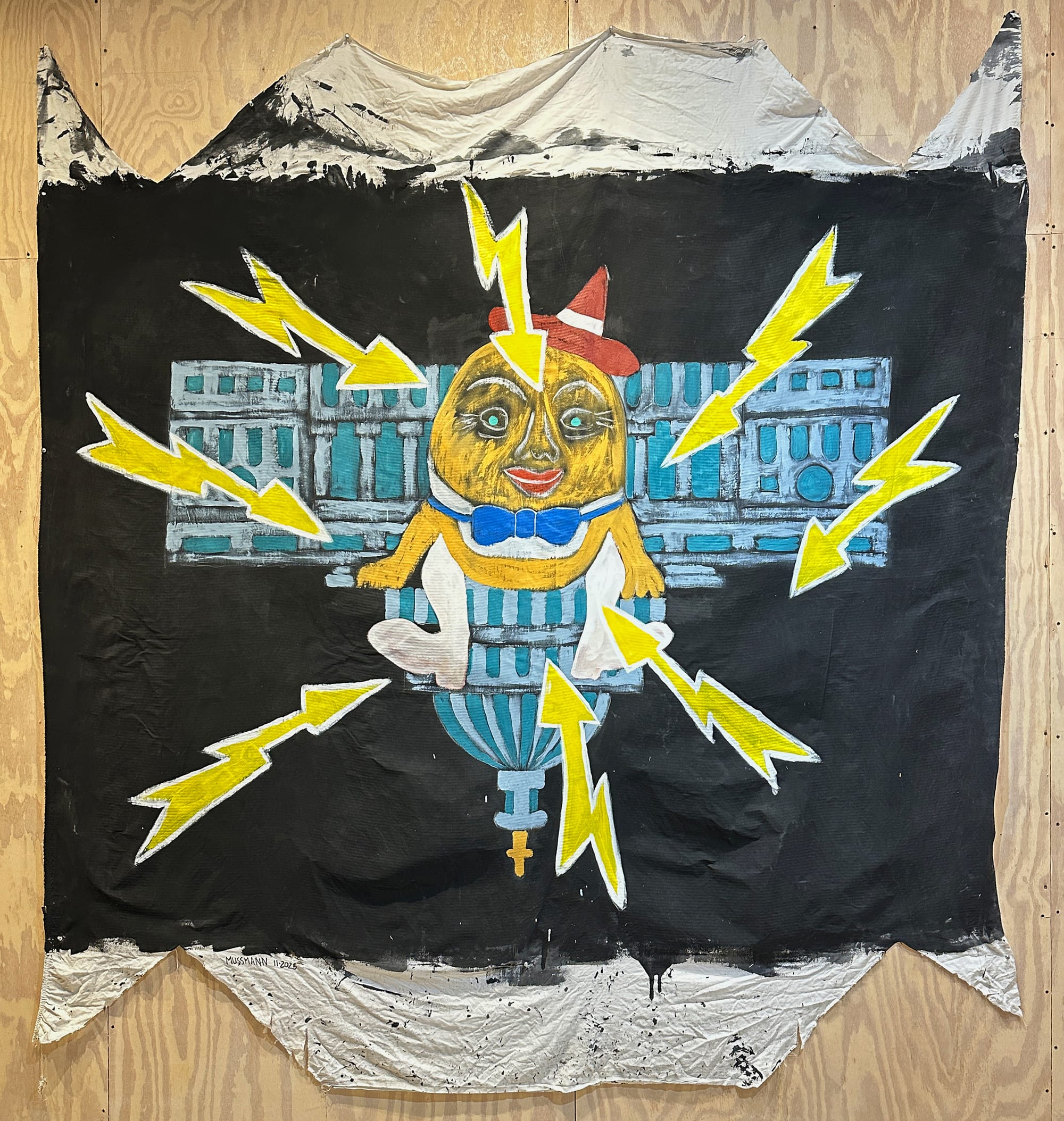 TSL co-founder Linda Mussmann is part of a generation of old-school artists who continue to redefine the notion of the sociopolitical in art. Featuring a series of recent paintings (all works 2025), some painted on bedsheets, Shebang at TSL embodies her passionate stance against political passivity. Works such as “Fire Five Alarm” include two patches of bright color side by side with a grid overlay and an urgent run-on sentence that reads in part “is anyone listening is anyone hearing.” Meanwhile, “Was it Was it” boldly asks “was it was it ok ok ok ok or not or not” (I’d answer, given the state of the world, that no, it’s not ok).