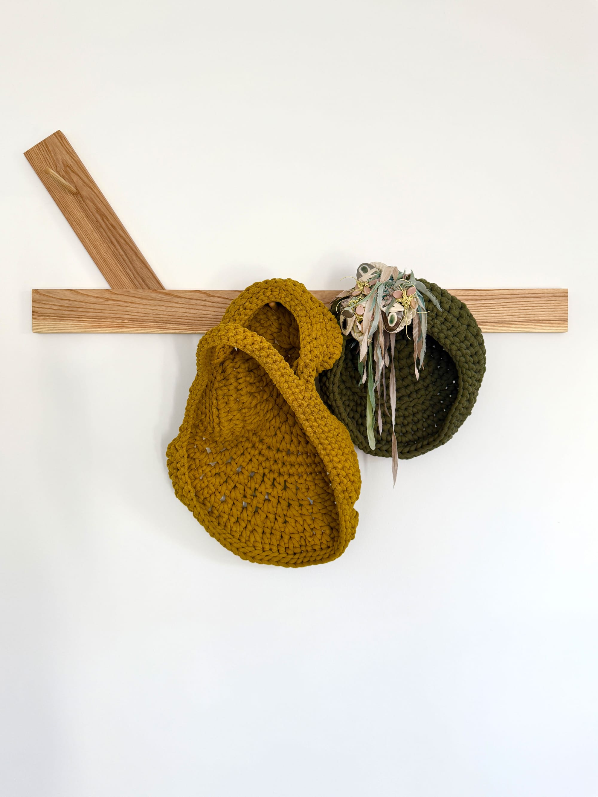 Using cotton rope to create original shapes that are one-part abstract sculptures, one-part bespoke fashion items, Karen Kimmel is redefining the art of cord. Featuring 23 hand-woven “basket” pieces (all 2025), Basket as We, Basket as Me at Maiden Lane Gallery honors the shape as both familiar and visionary. “Case 1 – 2 Goods” is a smaller pink-cord creation hanging below a gray French-beret-meets-balaclava above, both suspended on a thin wood plank against the wall. “Tender” features a grayish-white shape that curves upward like a banana as three loose cords dangle freely, while “Case 5 – 2 Goods” consists of a white hat-like “basket” and tan animal-like “basket” perched on opposite sides of a piece of wood, domestic and sophisticated in its beauty.