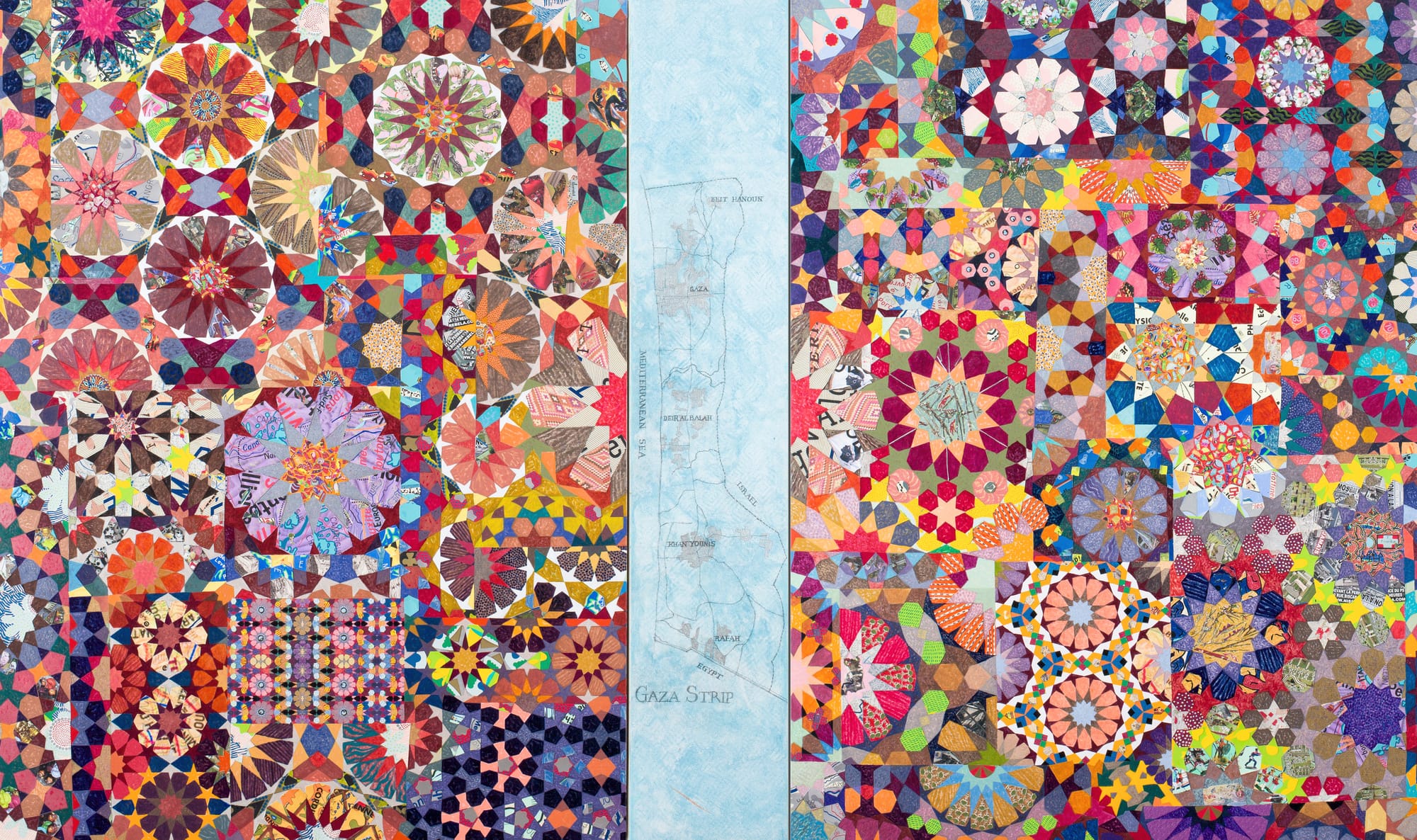 I first learned of Joyce Kozloff’s diverse artistic practice and alignment with feminist art during the late 1990s, and her work continues to inspire a contemporary generation today. Joyce Kozloff: Contested Territories, 1983-2023 at the Everson Museum of Art reflects her tenacious spirit and politically charged art. The centerpiece of this show is her “Targets” (2000) sculpture, a walk-in globe with aerial maps of locations bombed by the US military between 1945 and 2000 painted on the inside. “Jeez” (2012) includes countless cultural images of Jesus from all parts of the world, while “If I Were a Botanist (Gaza)” (2015), a bright mixed-media work with glorious star-like patterns alongside a map of the Gaza Strip, highlights life’s persistence amid devastation.