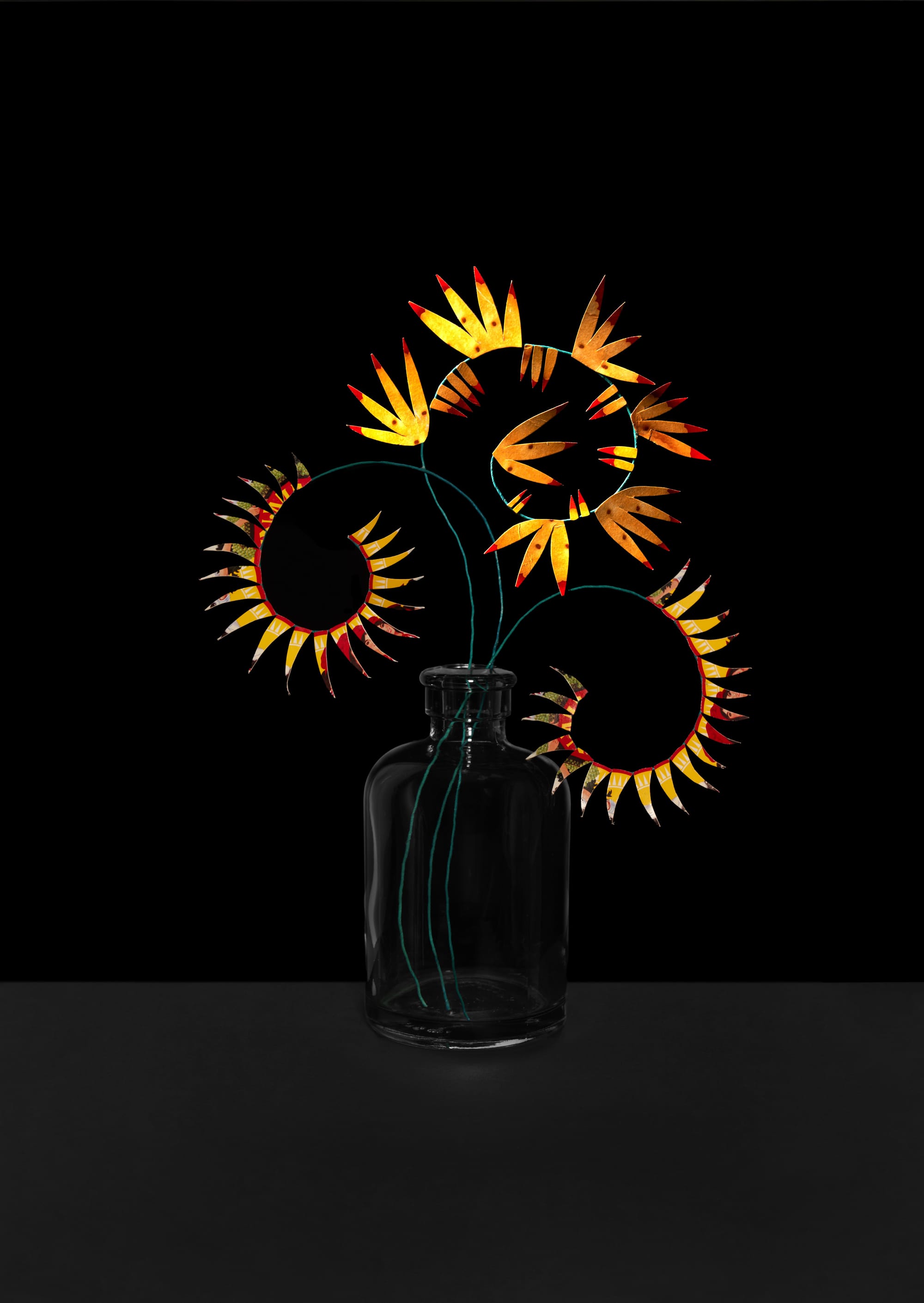 Through her tinkering with upcycled materials, including food packaging, plastic medical waste, and other discarded objects, Nina Katchadourian creates an eccentric universe of original design. Fake Plants and Other Curiosities at the Hyde Collection brings together sculptures and photographs from her Fake Plants project, begun during the COVID-19 pandemic in 2020, installed in both the main gallery and throughout the Hyde House. Her photos document lovably quirky works such as “Fake Plant #43” (2021), a bright sunflower made of paper product, and “Fake Plant #45” (2022), a happy little chorus of white balls that float upward from a rock. “Plant #53 (Joshua Tree)” (2025) is a cardboard cactus that looks like it arrived fresh from the California desert, while “Fake Plant #35” (2021) is a burst of ghostly white shapes that cascade like fireworks against a black night sky.