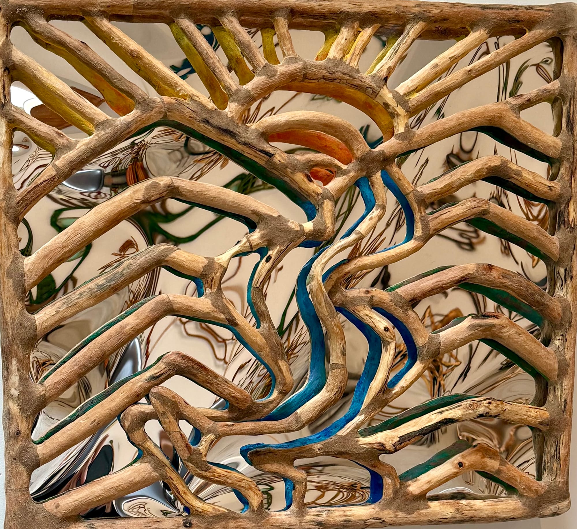 Each work here is made of no less than 80 different pieces of twigs and broken tree limbs — which is to say that the title of Loren Eiferman’s exhibition, Gathering of Sticks, keeps its promise. Her ritualistic artworks are simultaneously organic and futuristic: “Powerstick #1” (2018) consists of three long sticks that reach in different directions, each crowned with a distinct shape; altogether, it's a glowing vision of mystical power. “Albutilon” (2022) bursts forth looking like a flower-face, while the metallic green “Salvia” (2022) takes the form of a noble tower of abstract configurations.