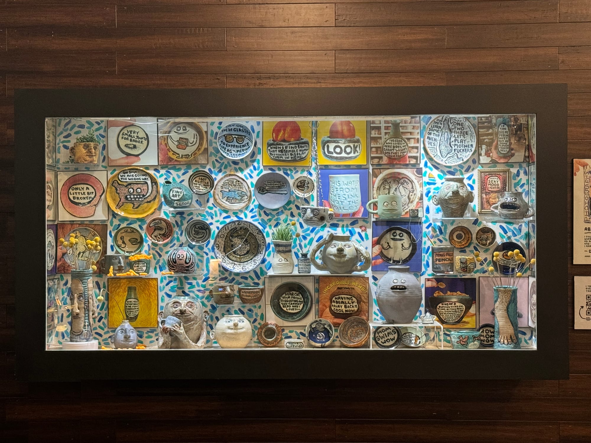 Motivated by the intrinsic ties but lack of formal collaboration between visual arts and comedy, curator Lisa Levy joined forces with the Brooklyn Comedy Collective to present Dog House Gallery, an exhibition space situated in the Collective’s lobby. Spotlighting artists whose practices are buoyed by humor, Dog House Gallery complements the comedy performers on the Collective’s roster through inter-medium conversations. Nancy Elsamanoudi, a local artist and parent to a fabulous poodle named Fergus, has taken over the exhibition space with Donut Dog, a body of mixed-media paintings playfully examining our attachments to both domestic and wild animals, primarily through the lens of viral social media content. —RN