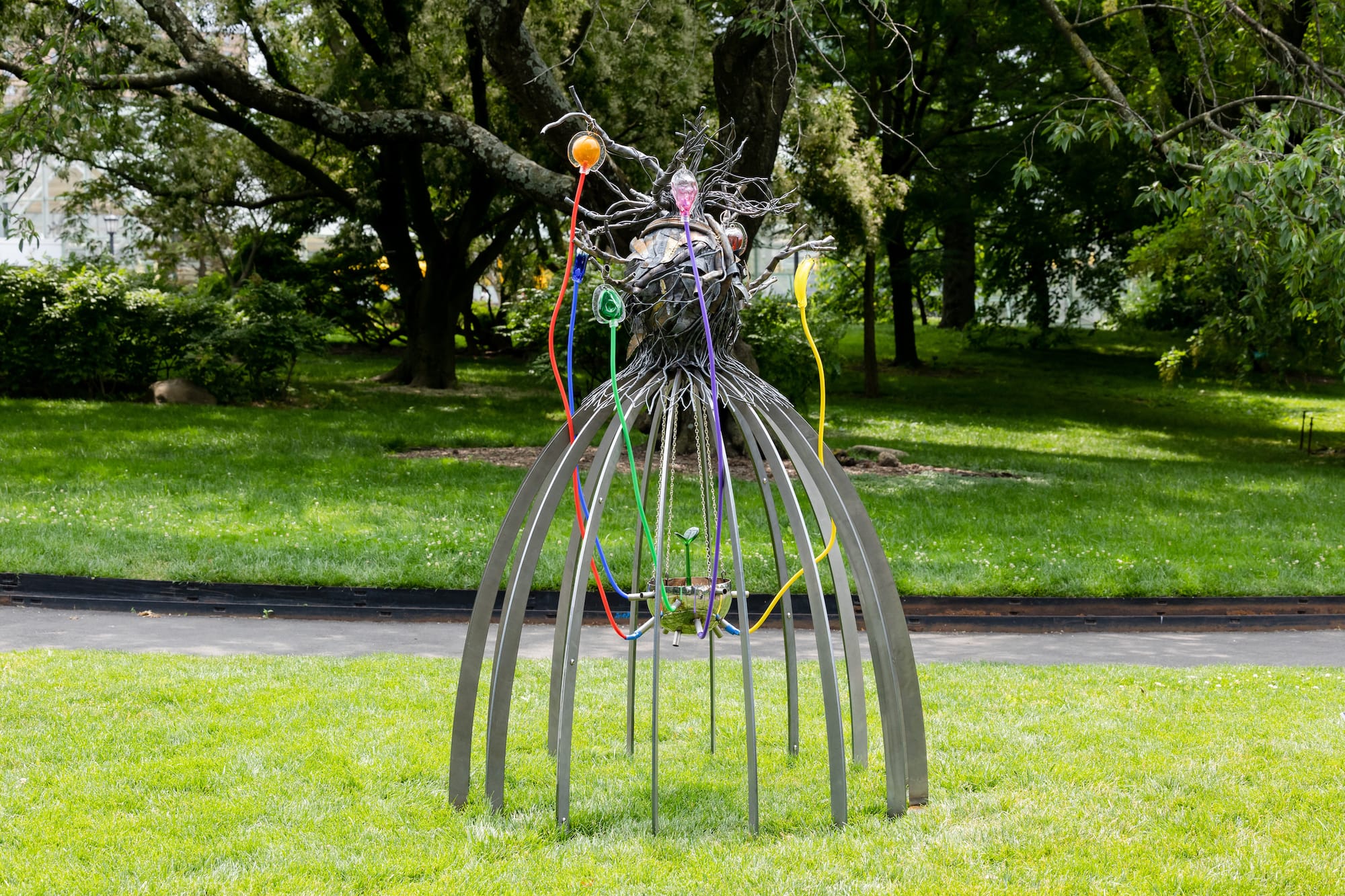 At the Brooklyn Botanic Garden near Prospect Park, six site-specific installations presented though a collaboration with Ankhlave Arts Alliance are part of a larger initiative paying homage to nature's tallest plants. The works range from Sherwin Banfield's tree sculpture "Botanical Boombox: Brooklyn Branch," bearing speakers that play music by Brooklyn Hip-Hop artists, to Natsuki Takauji's dress-shaped tree draped with colorful glass tubes. The narrow hoses look like hospital IVs and water an interior planter in a reflection on the cycle of life.