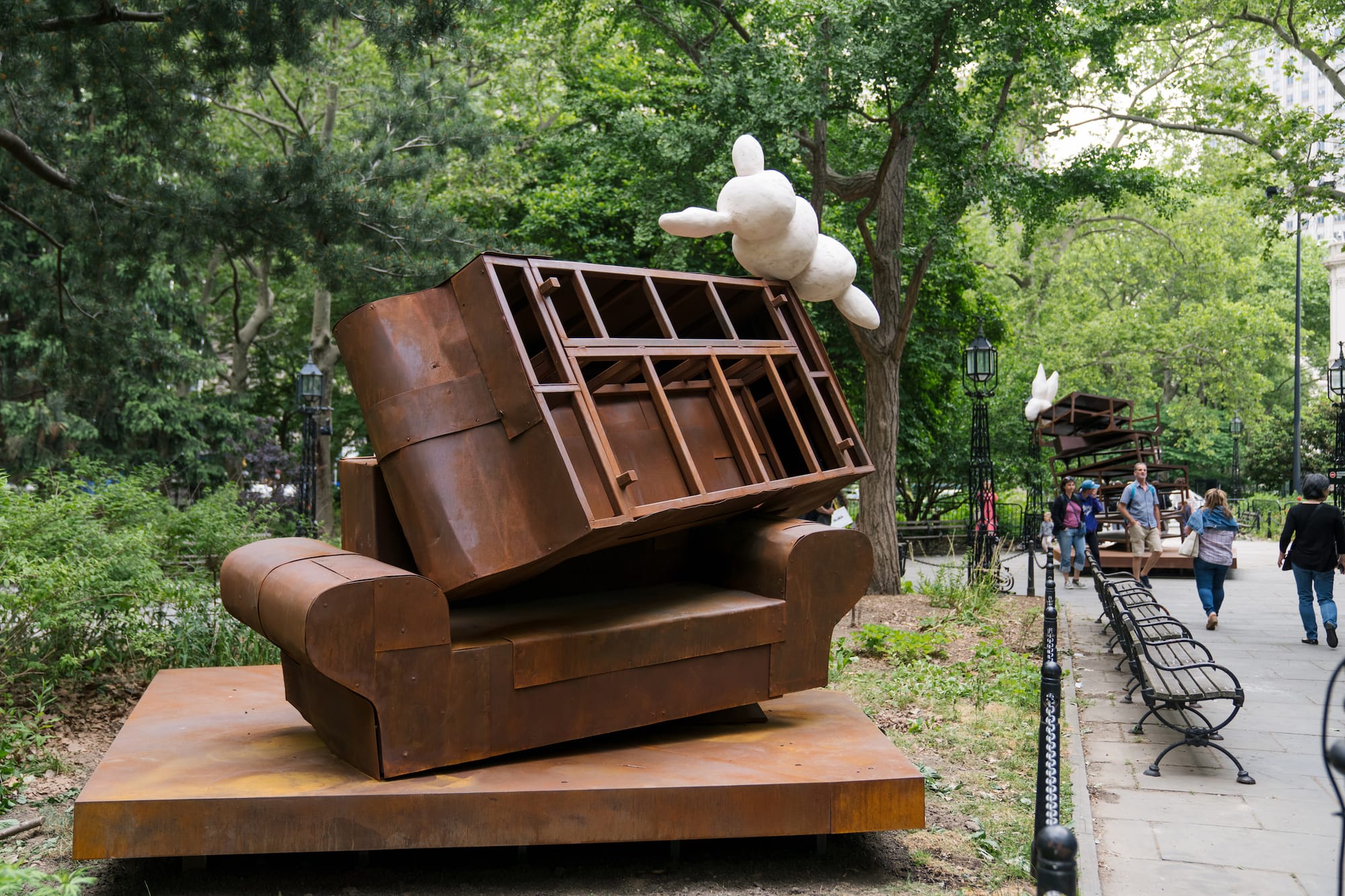 Sculptor Phyllida Barlow left behind a massive legacy when she died this year at the age of 78. Her oeuvre features what the artist called "nonmonumental" works, which she often created using everyday materials such as plywood and styrofoam. At City Hall Park at the Southern tip of Manhattan, a series of sculptures titled PRANK (2022–2023) highlights some of Barlow's best work — and some of the last pieces she created before she passed away. The sculptor stacked replicas of furniture in precarious piles and decorated them with her famous bunny ears.
