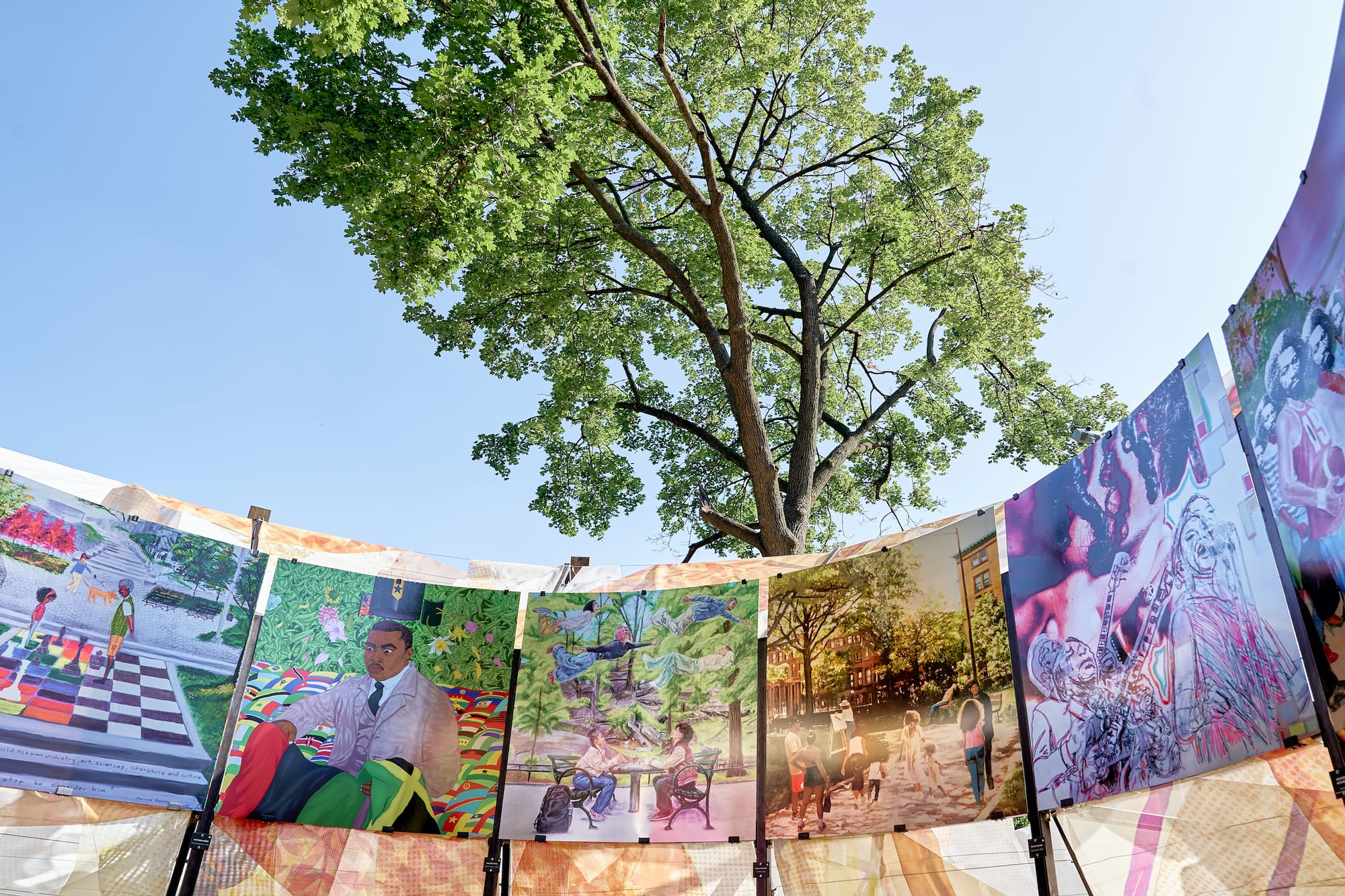 In Harlem's Marcus Garvey Park, artist and architect Jerome Haferd's "Sankofa" (2023) has transformed a patch of grass into a reflection of the neighborhood. Visitors can sit on the benches underneath the work's canopy and gaze at its interior imagery: illustrations celebrating the histories and futures of African, Afro-Caribbean, and Indigenous communities and the Harlem neighborhood itself.