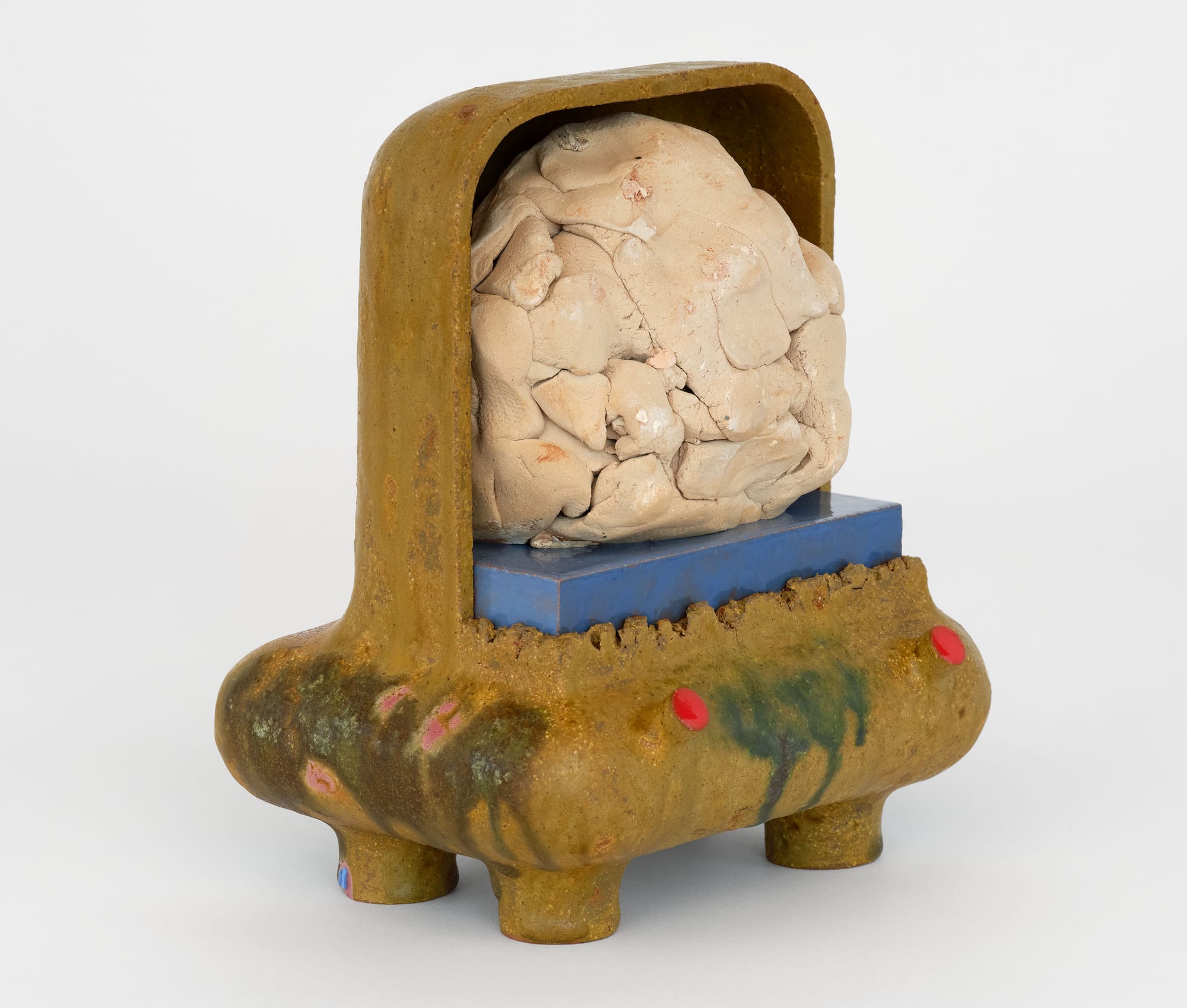Zachary Leener's enigmatic terra cotta sculptures take precedents like Ken Price's organic minimalism or Robert Arneson's outlandish Funk art, mashing them into novel, enigmatic forms. He often adds items that bear personal meaning into his clay body, lending the resulting sculptures an autobiographical significance. Cloud Chips features nine new ceramic works that highlight his mix of playful formalism and psychological depth.