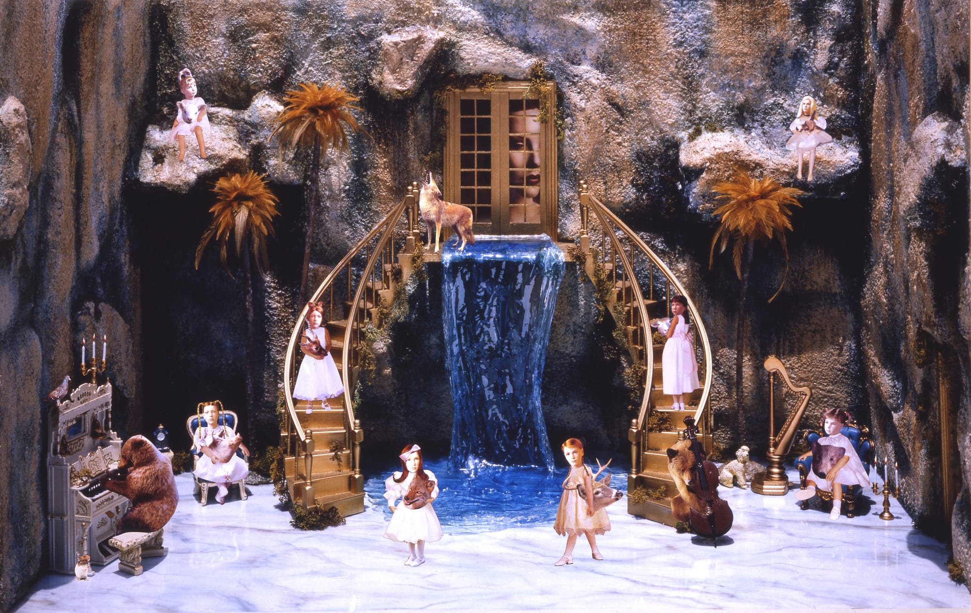 Marnie Weber's The Dollhouse (2002) is a storybook house composed of 11 rooms, each of which reveals another chapter in this surreal, psychological drama. The monumental model measuring six by 10 feet (~1.8 by three meters) features a snow-filled room with a frozen pond, a dust room covered in sheets, an autumn room filled with leaves, and a waterfall cascading down the grand staircase. Weber photographed each room, collaging ghost-like figures, models clipped from magazines, and animals into the c-prints, suggesting narratives that are absent from the sculptural home. This exhibition offers a rare chance to see the complete work, which hasn't been shown in Southern California since 2005.