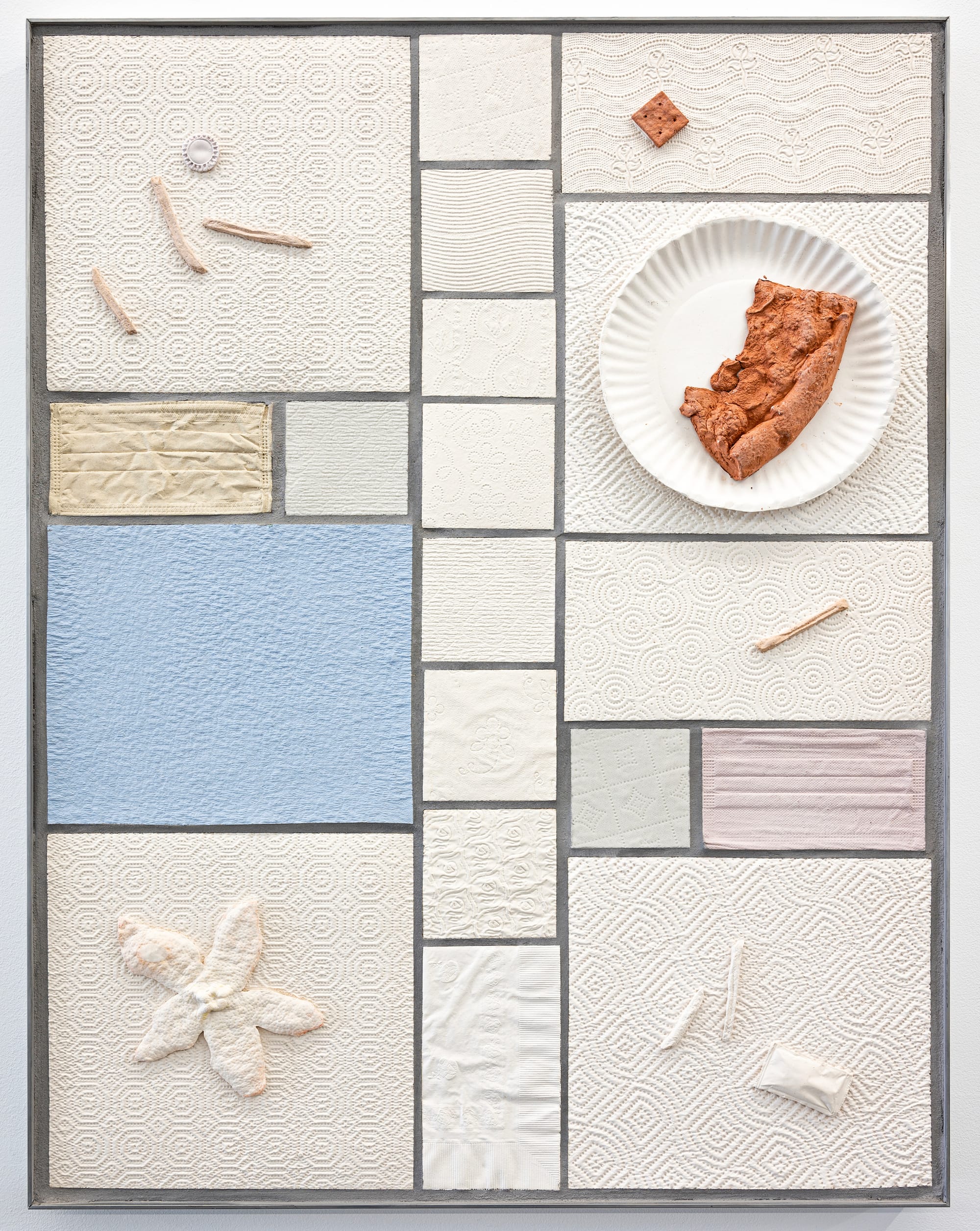 Ry Rocklen’s practice largely involves uncovering the extraordinary within the ordinary, and his steadfast commitment to the everyday currently spreads across two galleries in LA. Shelf Life at Wilding Cran includes wall-mounted mosaics, mundane Mondrians cast from bath tissue, paper towels, and pizza crusts, while the gallery floor is littered with shiny aluminum versions of Ritz crackers, goldfish, and saltines. Sand Box Living at the nearby Night Gallery features shoebox-sized ceramic sculptures based on Jackrabbit homestead cabins in the Mojave desert, inside which Rocklen has placed replica Reeboks, creating a scale shift that is at once whimsical and unsettling.