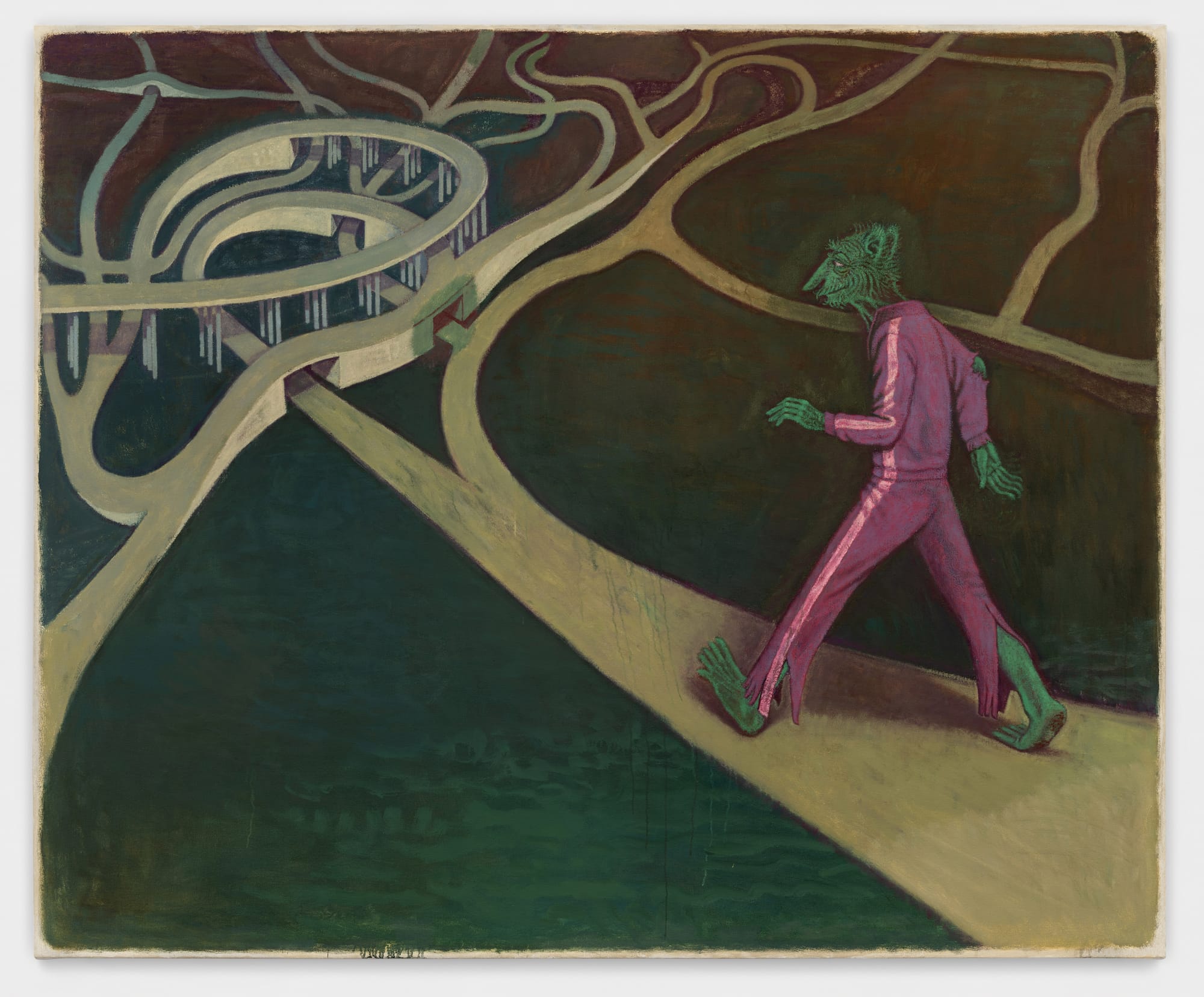Clayton Schiff’s surreal canvases depict cartoonish human-beast hybrids in scenes characterized by narrative ambiguity: drifting alone in a rowboat at night or strolling down a path that branches off into a maze of freeway ramps. These figures swing between existential dread and hopeful curiosity, capturing the tragi-comic essence of the human condition. His current exhibition at Harkawik is aptly titled Routing, which can convey orderly travel and networks of information, as well as disorganized withdrawal and defeat on a field of battle.