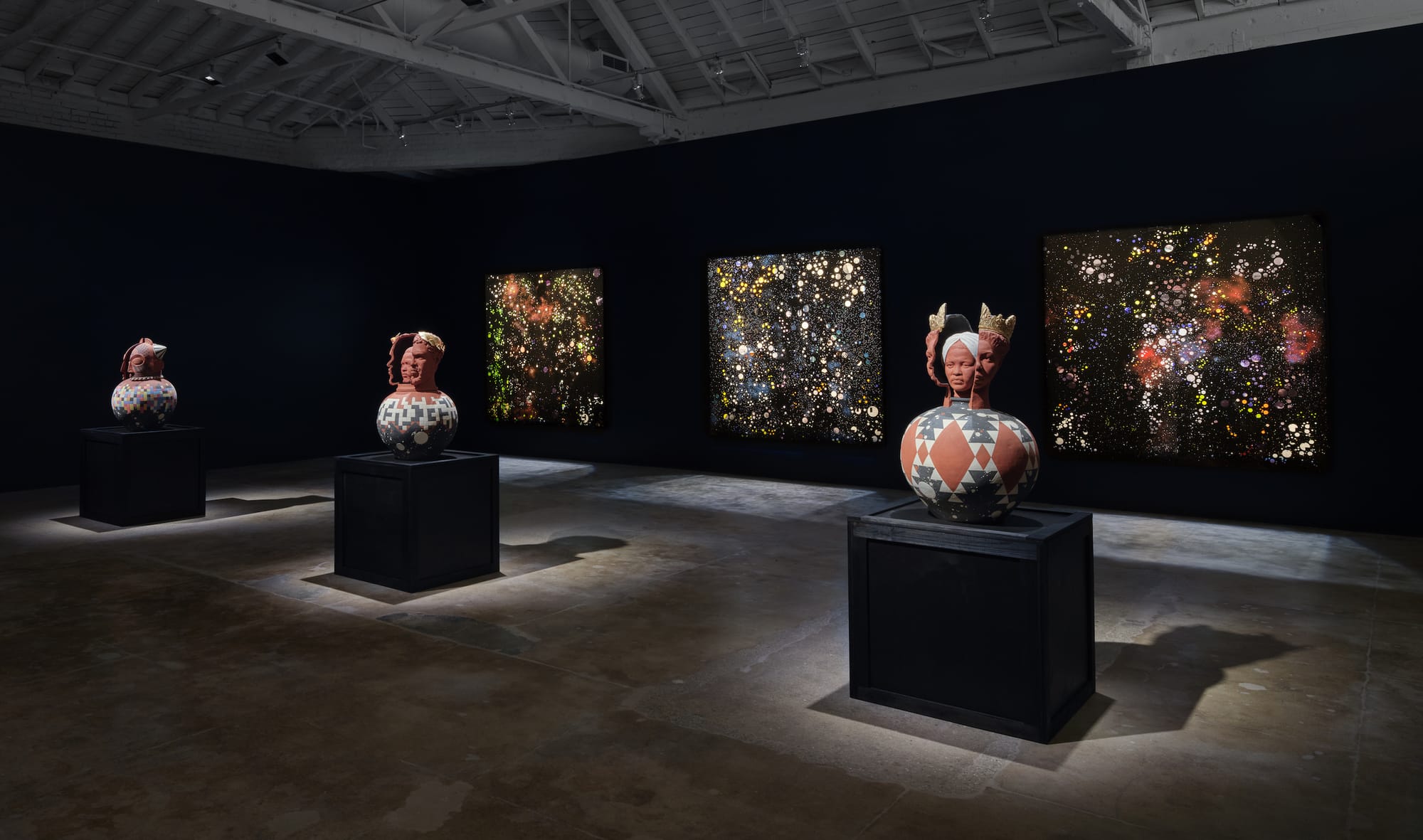 Tavares Strachan employs a range of materials — bronze, marble, hair, neon, and sound — to explore themes of light and darkness in his current exhibition at Marian Goodman’s new LA space. The show extends the artist's ongoing research project begun in 2018, The Encyclopedia of Invisibility, which unearths forgotten or overlooked histories related to the African diaspora. To this end, Magnificent Darkness includes ceramic sculptures of important figures such as Nina Simone, assassinated anti-Apartheid activist Steve Biko, and Matthew Henson, an African-American explorer who discovered the North Pole; a neon and audio piece with a composition based on the writings of James Baldwin; and “galaxy paintings” that draw parallels to unseen forces at play in the cosmos.