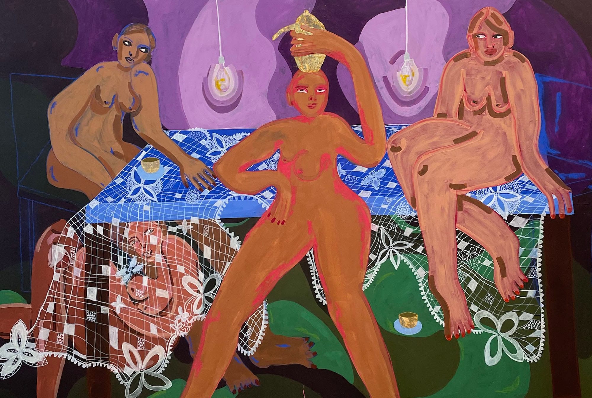 For Karla Diaz, painting is not just a form of expression, but a way to reclaim her memories. After suffering a stroke in 2017, Diaz began a practice of painting every night as a way to help her retain information. The stroke also left her with insomnia, influencing the imagery that fills her paintings and reflects a surreal, liminal landscape. With a vibrant palette and crisp lines reminiscent of comic books, Diaz's paintings combine childhood recollections of Mexico and LA, domestic family scenes, pop culture, fantasy, and dreams with a focus on social justice, a crucial part of Slanguage, the community art space she co-founded with her husband, Mario Ybarra Jr., in 2002.