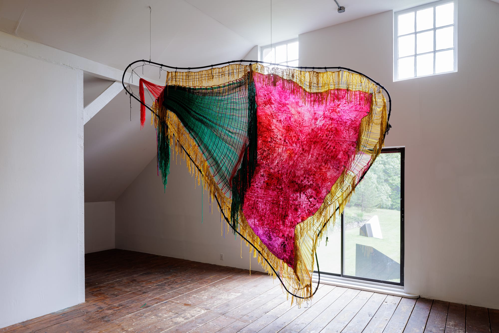 At the American Abstract expressionist painter Al Held’s former drawing studio, Michelle Segre’s solo exhibition, organized by River Valley Arts Collective for the Al Held Foundation in Boiceville, is electrifying in its disorderly beauty. Featuring seven new entirely site-specific works, all made in-situ earlier this summer, and composed of mixed media including steel, yarn, felted wool, glazed ceramic, aluminum, acrylic polymer, and textiles, Segre’s installation is both a feat of creative engineering and an innovative embodiment of quasi-scientific structures. “Sigmudrite II” recalls an amiable spiderweb with roaming planets caught in its orbit, while “Voidsoprtion 003” is a large round circle whose black hole at center seems to pull us in, as a dangling red “Lavamajore” sunburst floats nearby. The installation carefully orchestrates a balance between our super-sensible world and the unseen supernatural forces that govern the universe.