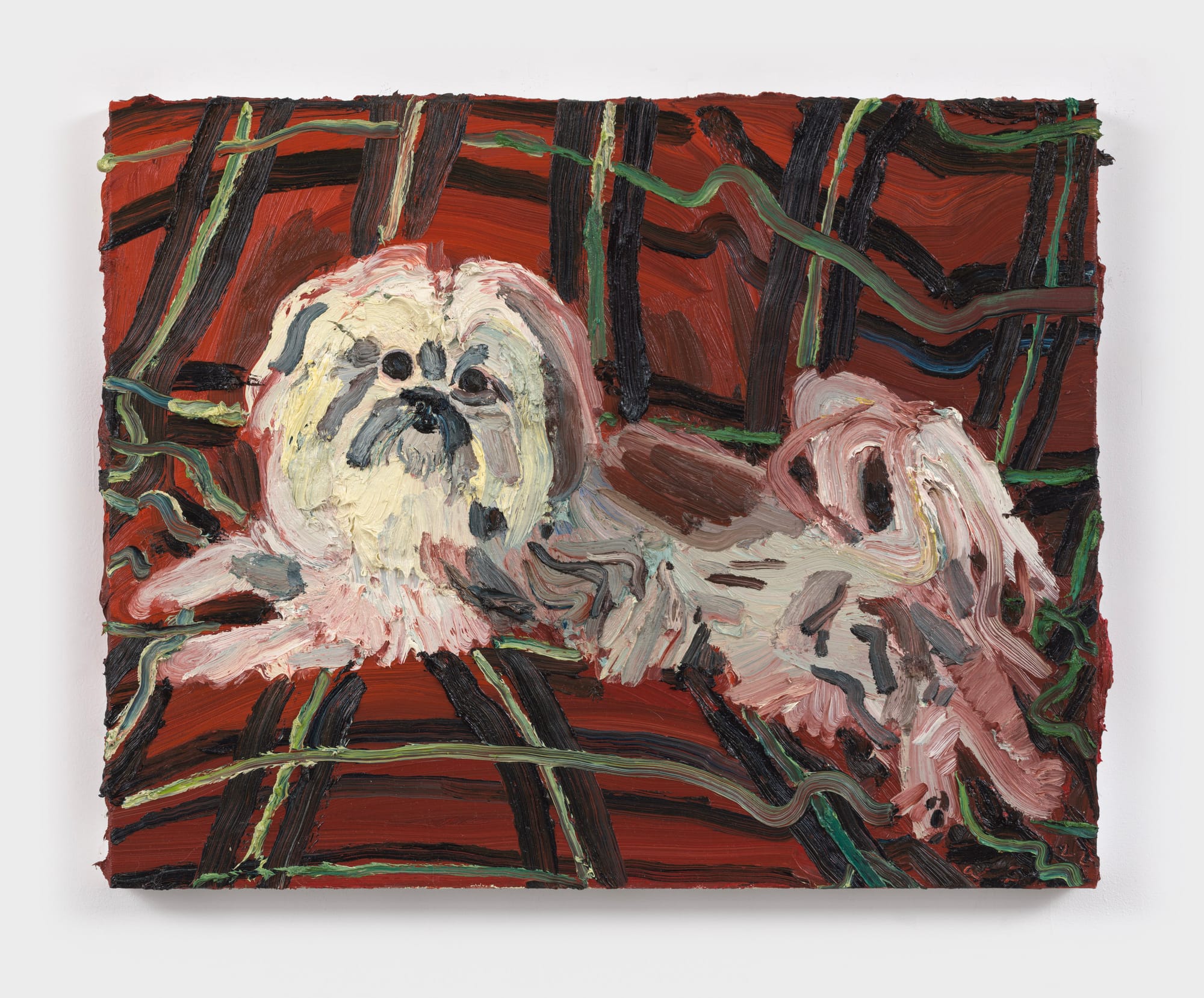 “Dogs & Cats” was the theme of September Gallery’s first open call for submissions, aimed at supporting the Columbia County Sanctuary Movement, and 10% of gallery sales will be donated to this local organization providing aid to immigrants. Across mixed-media artworks by 100 artists, happy-go-lucky canines and felines prevail. Daisy Noyes’s “The Two Daisys” (2025) is a lighthearted image of a woman at a table with a cabbage in front of her face as a dog looks up at her inquisitively, while Allison Schulnik’s “Rickles” (2022) is a loving portrait of a white pooch lying against red tartan. “Plink Plink” (2025) is a bright, graphic scene consisting of a dude, his guitar, and a cozy dog under his feet. Audrey Francis’s “Look Out” (2025) is the dictionary definition of a domestic scene, consisting of a quasi-psychedelic vase of flowers bursting in every direction as a stoic blue cat peers out at a verdant world beyond the window.