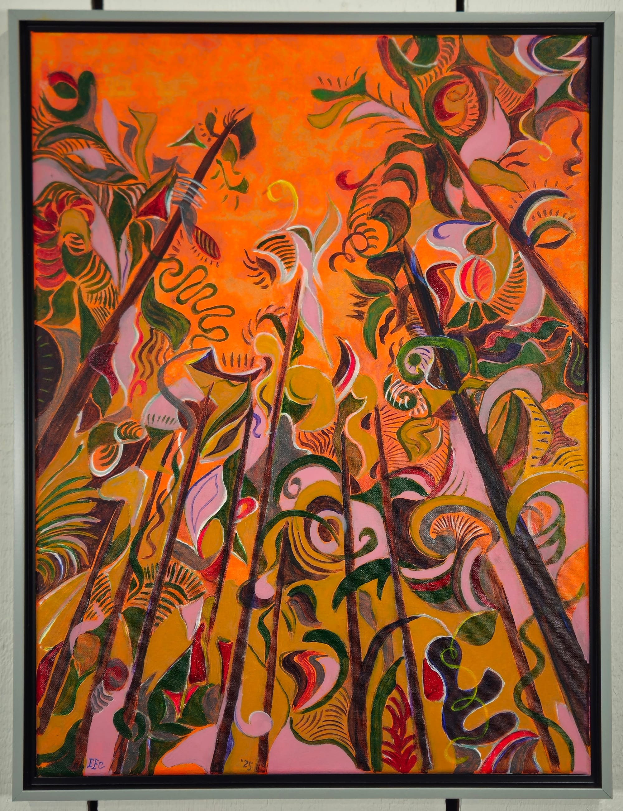 Exploring themes of identity and place, Between Here and There at Yellow Studio presents a juried member exhibition featuring mixed-media works by 22 women artists. Jessica Porter’s “Morning Sunrise” (2025) is a bright pop-inspired bucolic landscape, while Elizabeth Elder’s “Sculpture Garden Concert” (2025) lives up to its name with a symphony of wild tree-like shapes reaching upward amid an orange backdrop. Julia Berkeley’s “Guitar 22” (2023) is a striking abstract work with a Modernist-Cubist edge, and Carol Paik’s “Aerie” (2024) consists of repurposed textiles among other miscellaneous material. It features a tiny white abode atop a plushy mountain with a little bucket hanging down, a poetic vision that is equally charming for its dollhouse size.