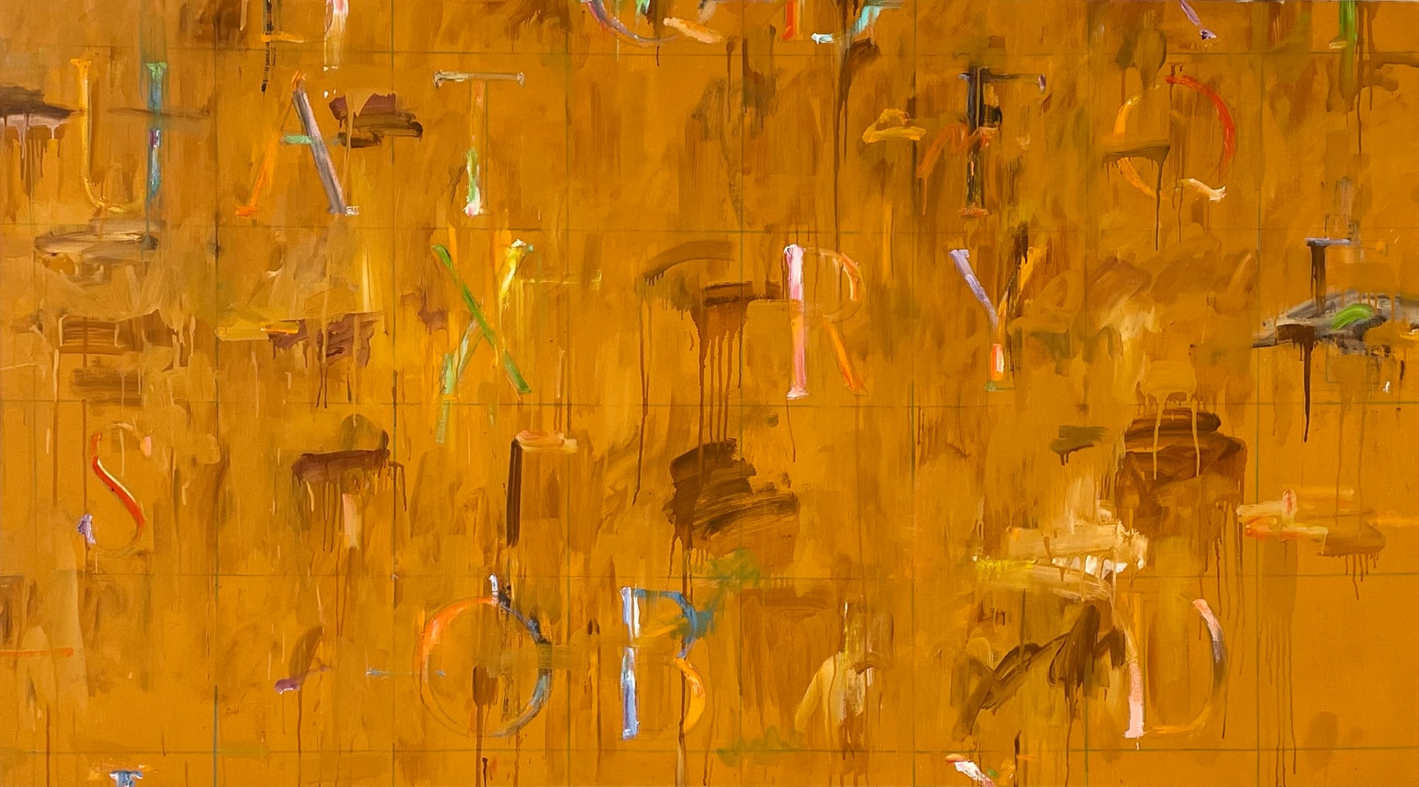 Kikuo Saito’s dashing explorations in paint seem to play tricks on our eyes. Kikuo Saito: Reminiscence in Color at KinoSaito presents older works by this master of abstraction. “Perugia” (1995) features a grid with letters haphazardly painted within, forming nonsensical words and expressive patterns. In “Blue Sand” (1996), both grid and letters are engulfed by cerulean, while the letters in “Music Room” (2000) appear to pop from their tannish muddy backdrop in contrast. Finally, “Alfabia” (2002) radiates a powerful golden-ochre warmth.