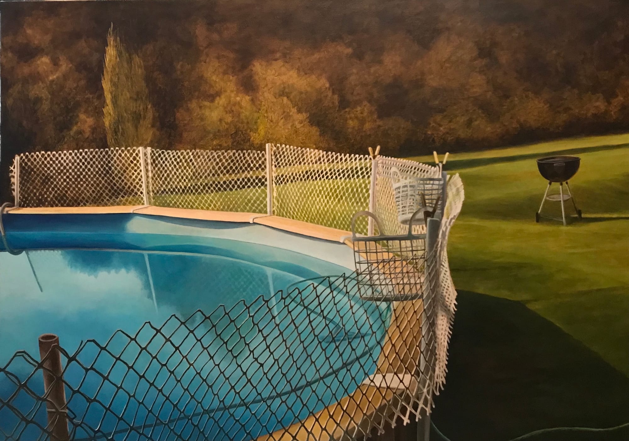 A series of sumptuous and moody oil paintings by Linda Griggs at the Front Room Gallery in Hudson reflects a feeling of solitude laced with a trace of strangeness. The story of the exhibition begins with works such as “Night Swimming” (2024) and “Sirens” (2023), in which aqua-tinted pools suggest midnight skinny dipping on sultry summer evenings. The ambiance lightens with works such as “Hamilton Fish Kiddie Pool” (2023), in which empty lifeguard chairs and recliners anticipate an influx of seasonal swimmers and sun worshippers. Griggs’s tale then takes a turn towards a hazy dream state: The existentially prosaic “Salad Bar, Myrtle Beach” (2022) depicts a spread of bowls full of colored Jello nestled amid a bed of wilting kale on ice. “Piggly” (2022) is perhaps the apex of this exhibition-as-memoir. We are witnesses to this strange black and white scene of two figures holding hands as they walk down a road smattered with old vehicles and incredulous folks staring at the oversized pink pig head of one of the pair. At the foreground, a child gazes outward at us in a scene that feels bizarrely nostalgic.