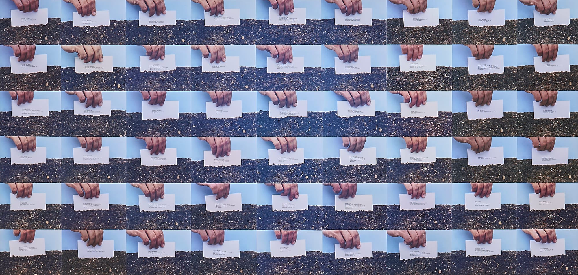 The history of humanity is riddled with stories of colonization and acts of violence toward Indigenous peoples. Landmines, curated by Sophie Landres at the Dorsky at SUNY New Paltz in New Paltz, presents the work of four artists whose camera-based work explores the role of landscapes as revealers or concealers of narratives. “Cabins and Shadows” (2019) by Dawoud Bey is a black and white photograph of a lonesome stretch of shadowed plantation yard, hinting at the horrors of slavery. Richard Mosse’s “Slaughterhouse, Rondônia” (2021) is an aerial drone’s view of this unforgiving location in the Amazon basin — and yet he turns this bleak place into an otherwise beautiful vision of psychedelic colors and shapes. Christina Fernandez’s “Untitled Farmworker (Photographic Collage)” (1989/1994/2020/2025) agitates for reform in its depiction of an anonymous hand repeatedly placing a white card with the name of someone who has died and their cause of death — usually, toxic farming chemicals — into the earth.