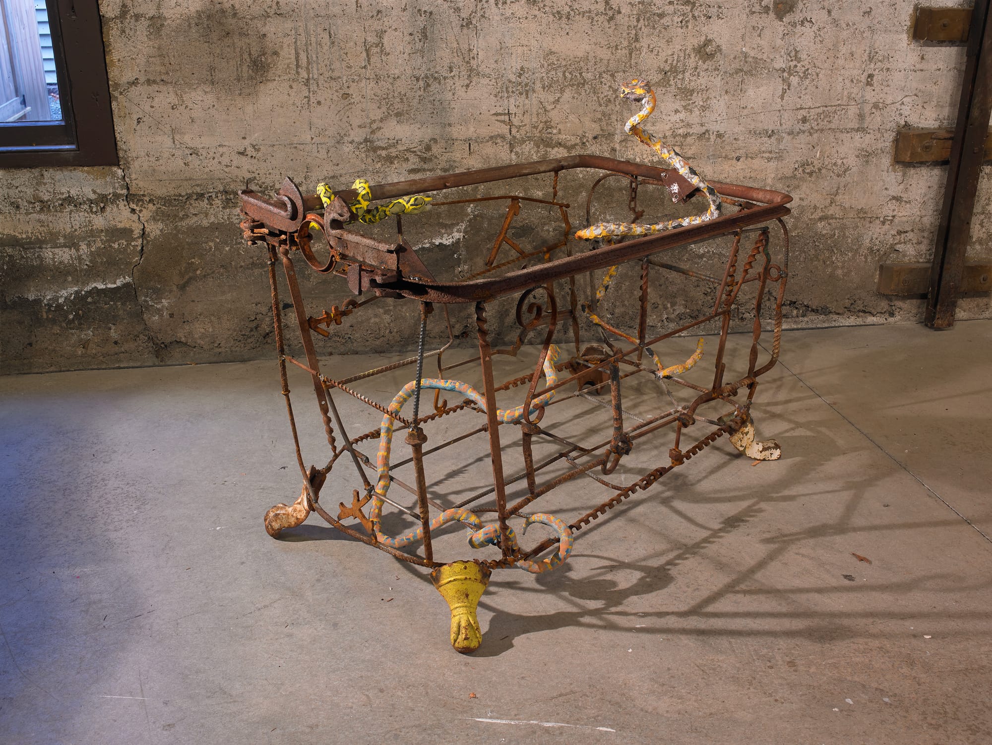 Z Behl is not afraid to go big. The first time I encountered the larger-than-life sculptures of this New York City-born-and-raised badass, I was smitten with her work. Pamela Salisbury Gallery in Hudson presents a four-story installation of recent multi-media works by the artist and her collaborator Kim Moloney (together known as BALONEY), including installation, paintings, drawings, and films. In “Artist as Coyote” (2025), Behl crafts a mythical half-human, half-animal out of cast concrete, metal, and stone; the shadows it casts are as compelling as its eccentric hunched anatomy. BALONEY’s “Harpy (3 Fates)” (2024), meanwhile, is a dynamic vision of another strange creature made from a wicker birdcage that appears on the verge of taking flight from a steel perch. And the duo’s “Fertility Tub” (2024) hints at an ulterior narrative with its surreal assemblage consisting of three snakes slithering around the empty metal frame of a tub. BALONEY’s “Portrait of the Artist as a Filmmaker” (2025) is the showstopper: Made of steel, concrete, and fabrics including lace, cheesecloth, and velvet, this elaborate harlequin character hangs down from the fourth floor and fills the open shaft of this historic carriage house with its monumental body, while Behl’s drawing “Plan for Carriage House” (2024) presents a sketch of this female trickster archetype balancing perfectly in a daring yogic position.