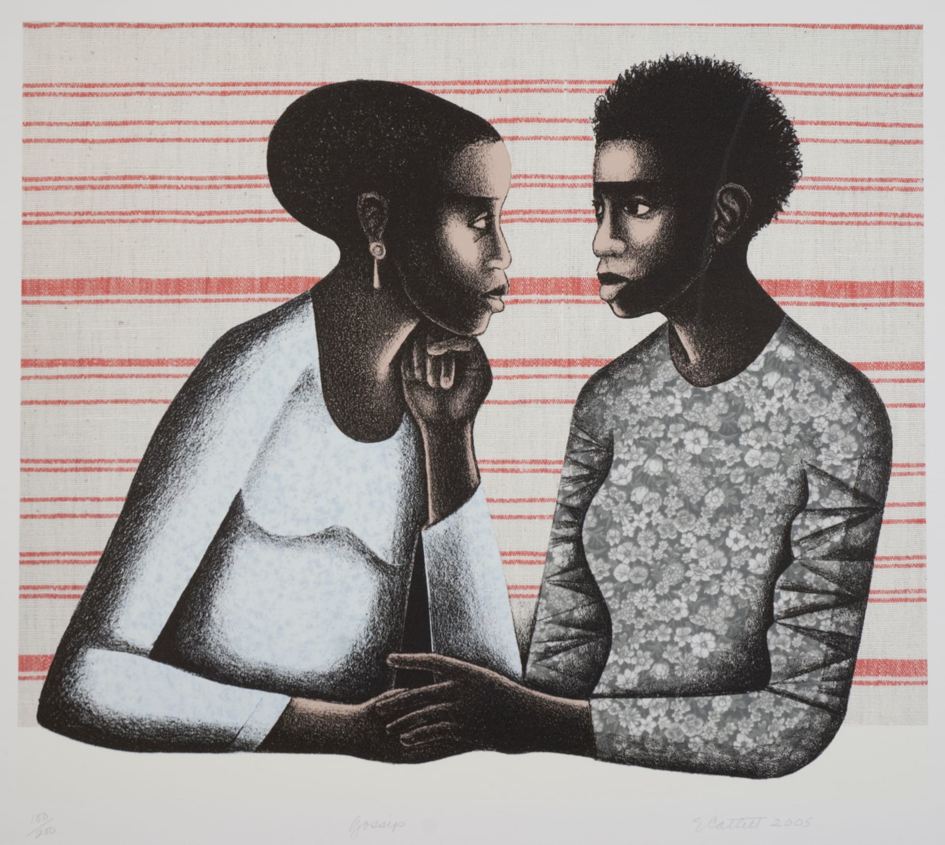 Making Connections: Highlights from a Decade of Acquisitions showcase the more contemporary spectrum of the Memorial Art Gallery at the University of Rochester’s collection of diverse creative practices from antiquity to now. Among the treasures included in this show are Judy Chicago’s “Earth Birth” (1985), a serigraph of a muscular naked female figure that appears to dissolve into the layers of undulating waves that encompass her is paired with George Platt Lynes’s gelatin silver print “Walter H. Roehmer” (c. 1944), is a quasi homo-erotic image of a sturdy man from behind with his arms wrapped in rope high above his head, in a complementary examination of gender. Mary Beth Edelson continues that exploration with “Some Living American Women Artists” (1972), an old-school photomechanical lithograph in black and white featuring a re-staged vision of The Last Supper with Georgia O’Keeffe as Christ and other revered women as the apostles that flank her at the table. “Gossip” (2005) by Mexican-American artist Elizabeth Catlett also celebrates women: It features two female figures that seem to be silently digesting a bit of intense news.