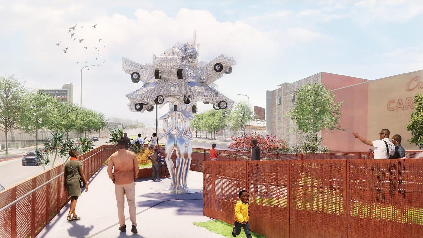 Both Artis Lane and Kehinde Wiley will reimagine traditional European statuary to reflect the neighborhood’s Black history and community. Lane’s “Emerging First Man” is a larger-than-life Black male figure cast in bronze, representing spiritual rebirth through adversity. Wiley, who grew up in South Central, will contribute an equestrian statue featuring a West African woman riding forward while glancing behind her, in the mode of the Sankofa bird. This can be considered something of a homecoming for Wiley, who was chosen for the Metro Young Artists program as a teen.