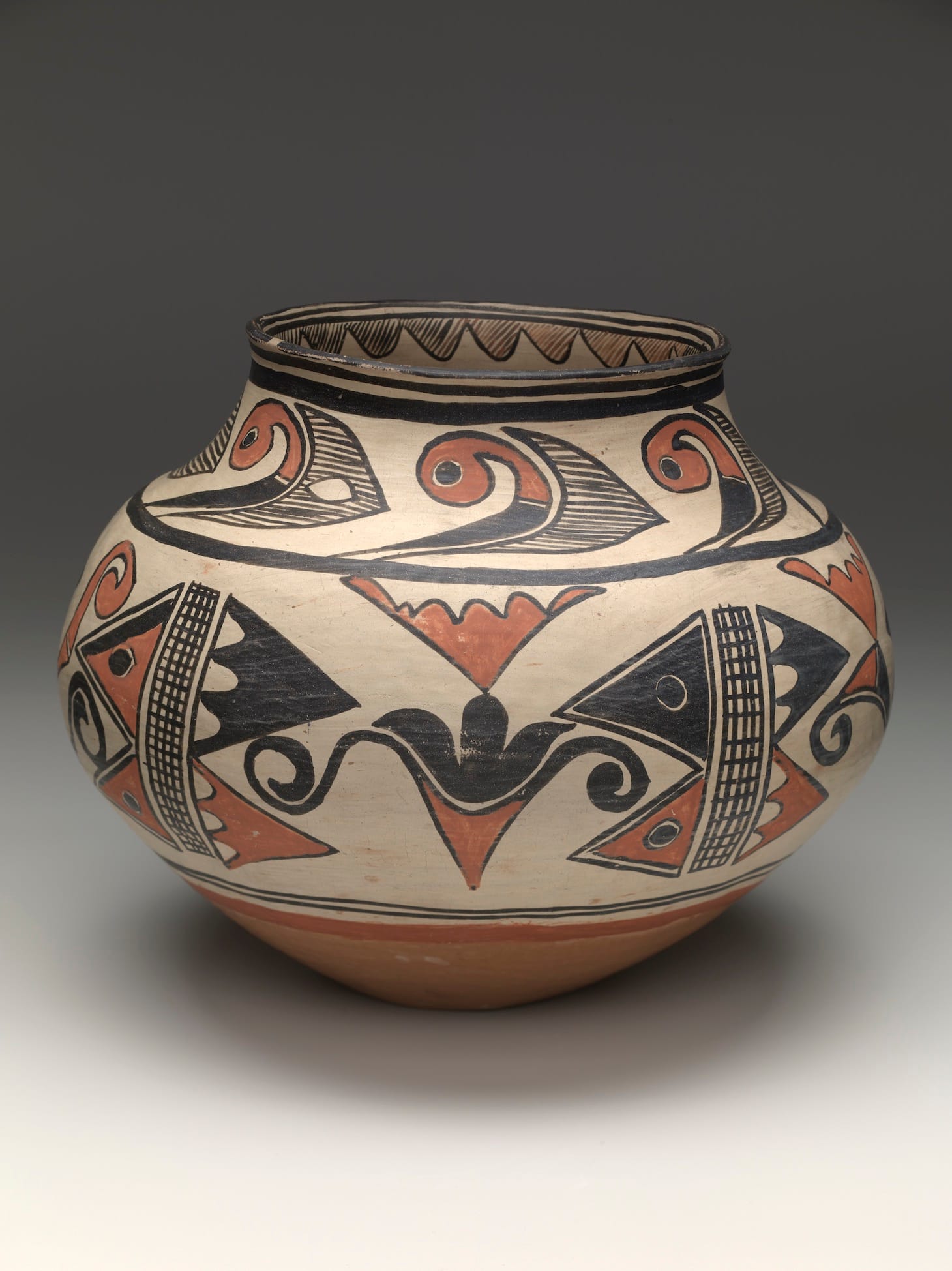 The six Tewa-speaking Pueblos — Nambé, Pojoaque, San Ildefonso, Ohkay Owingeh (formerly San Juan), Santa Clara, and Tesuque — line the Rio Grande north of Santa Fe. Tewa pottery became an important method of cultural practice and resistance after the Spanish arrived in New Mexico in the 1600s. The pieces in the collection were acquired by private individuals — primarily George Gustav Heye, who donated the majority of NMAI’s works — in the late 19th and early 20th centuries, and eventually given to NMAI. The collection at the Poeh was selected by representatives from the six Tewa Pueblos out of NMAI’s 500-plus pieces to represent the various Tewa pottery styles and communities. There have been many pottery methods over the centuries, including polished black Kapo pottery, ogapage polychrome, and black pots colored using cow or horse dung in the firing of the clay. To avoid the influence that the demands of tourism placed on the work, none of the pieces selected was created after the 1930s.
