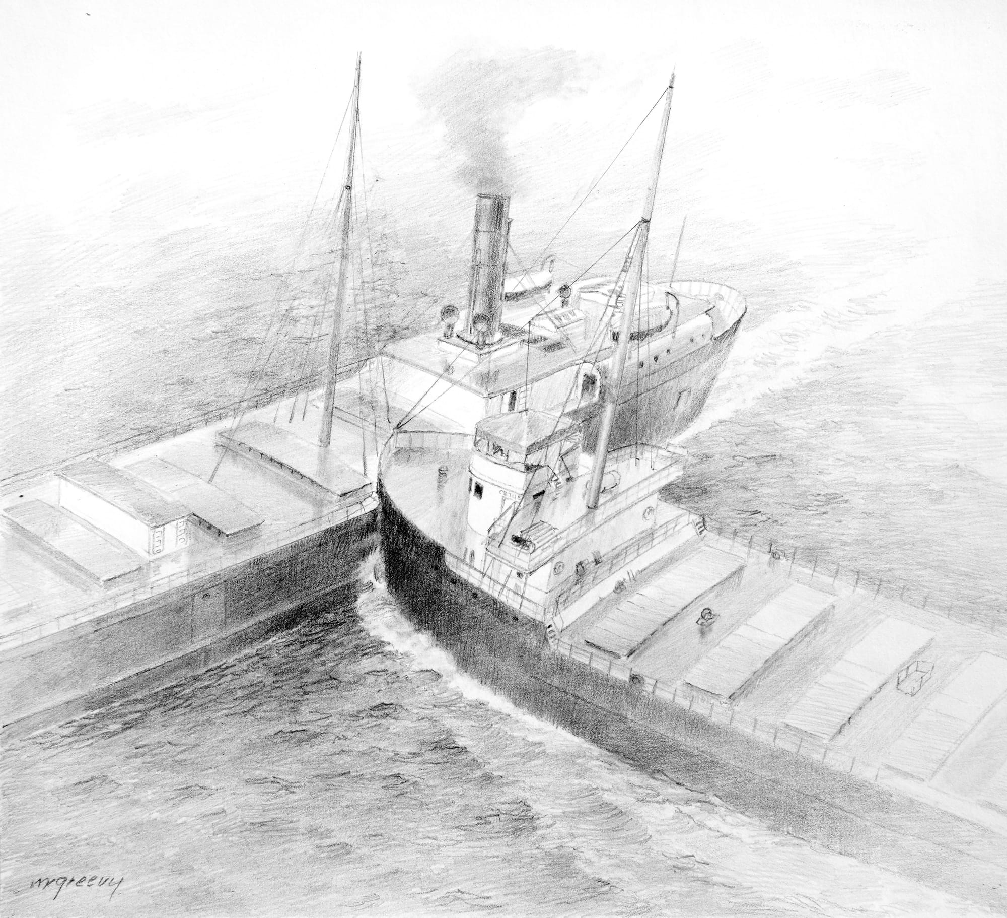 The 238-foot-long steel vessel, manned by a crew of 17 (and a bulldog as a ride-along mascot), was empty when it was struck by the Cetus, a 416-foot-long bulk freighter carrying a full load of iron ore. According to a report from the GLSHS, thick fog and wildfire smoke significantly reduced visibility on the lake and both ships were traveling at high speeds in precarious conditions. The captain of the Cetus kept the ship's engines moving forward, effectively "plugging" the hole driven through the Huronton and providing enough time for the smaller ship's crew to deboard onto the larger ship safely with no lives lost. One crewmember, first mate Dick Simpell, actually clamored back onto the Huronton to untie and retrieve the bulldog who had initially been left behind.