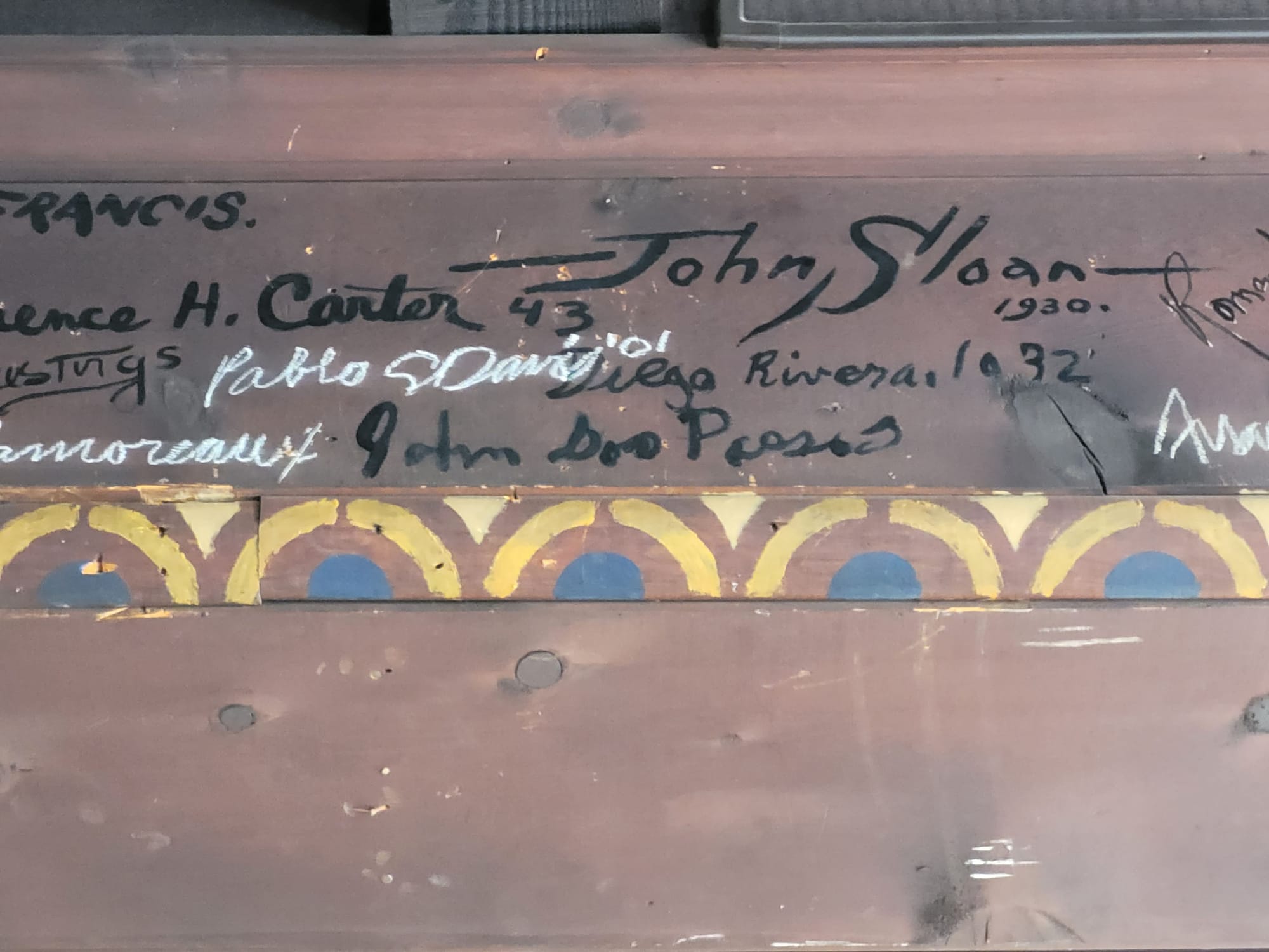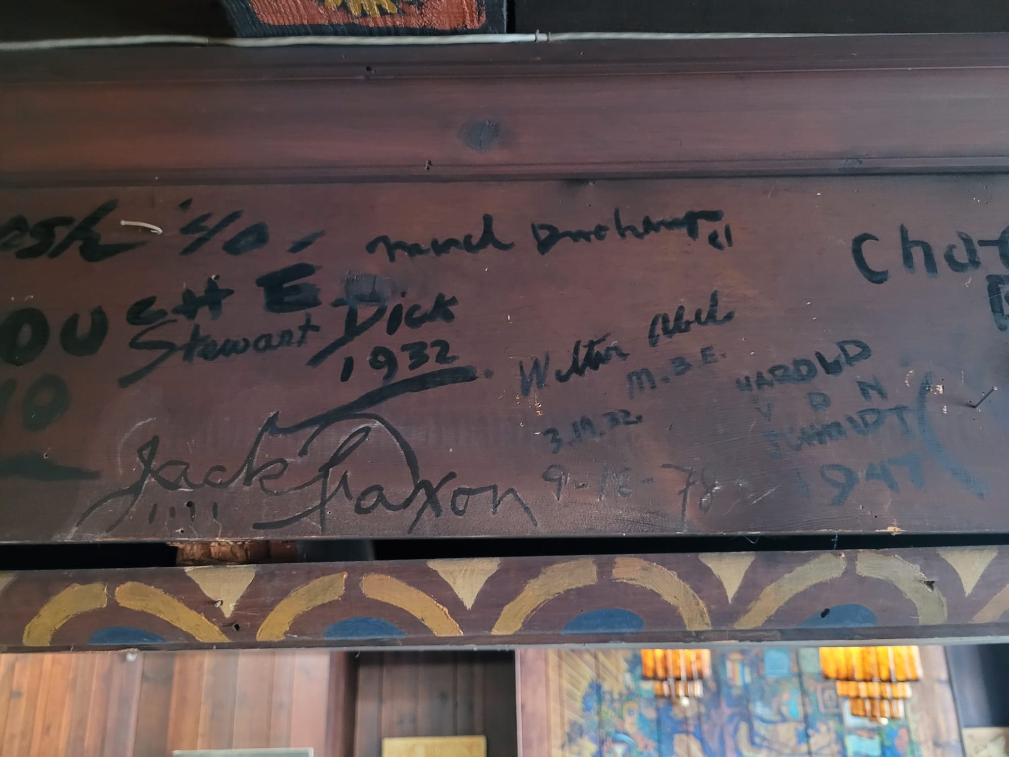 In its inception, the club was held at locations around the city, until an official “clubhouse” was formed in October 1928. Club members oversaw and executed all aspects of the building’s design, construction, and architectural and decorative elements — including assigning the role of head architect to Lancelot Sukert (1888–1966), who was chosen for the honor by the body of club member architects. It is unclear who had the original idea for the “guest book” — the sides and ceiling beams of the second-floor lounge where distinguished guests and important local and visiting artists have been invited to add their signature — although signature books and autograph collecting were common pastimes of the era.