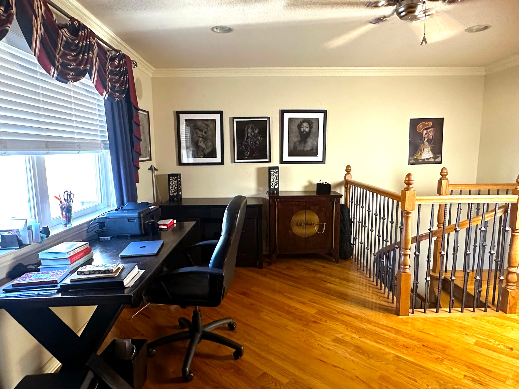 I have beautiful light and my space is filled with art, collected objects, books, and ephemera that inspire creativity. Facing the window, my desk is made from an old refinished wood door, and the texture brings me pleasure and a feeling of groundedness. The hardwood floors are perfect for dance breaks during the day.
