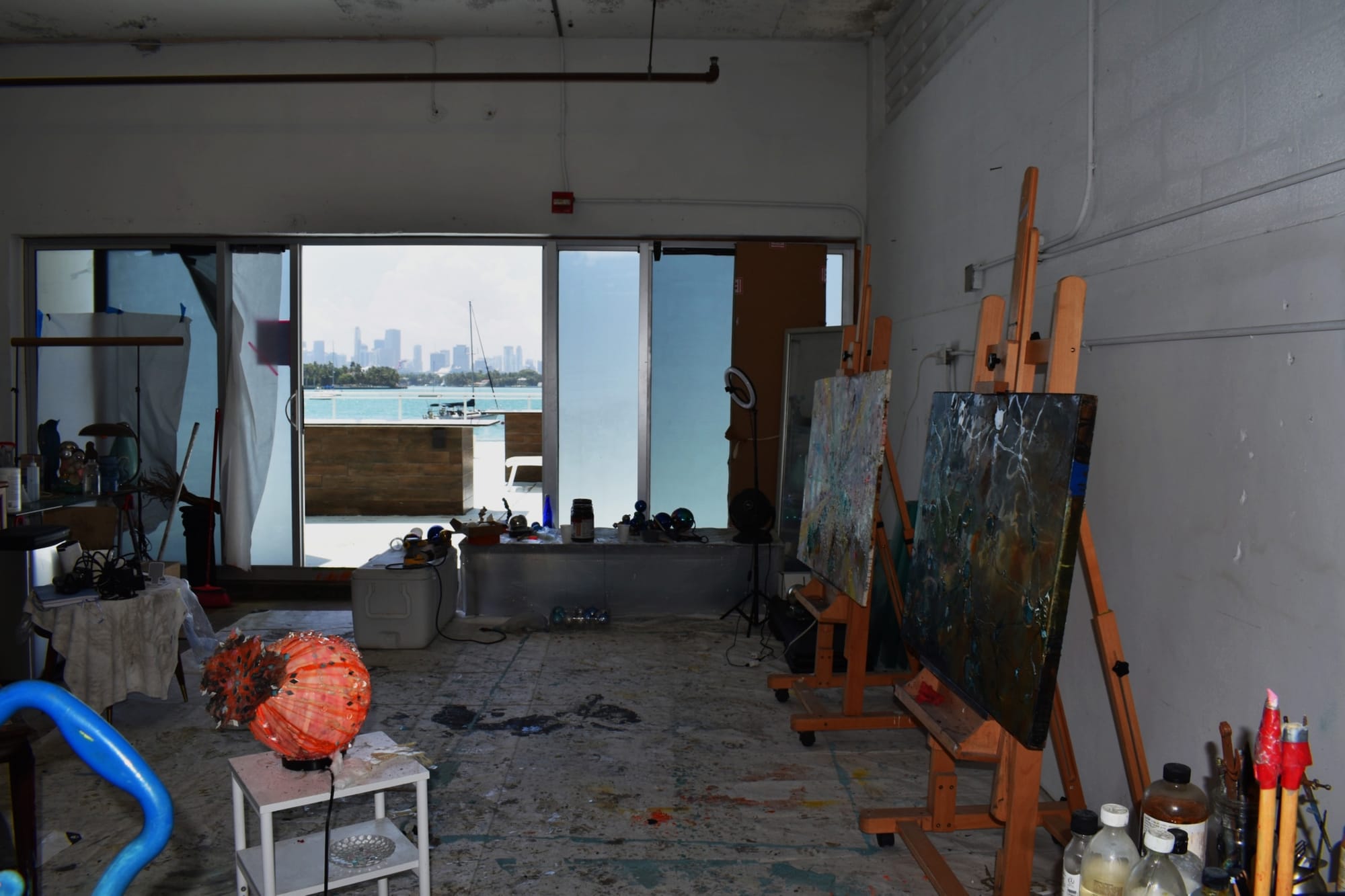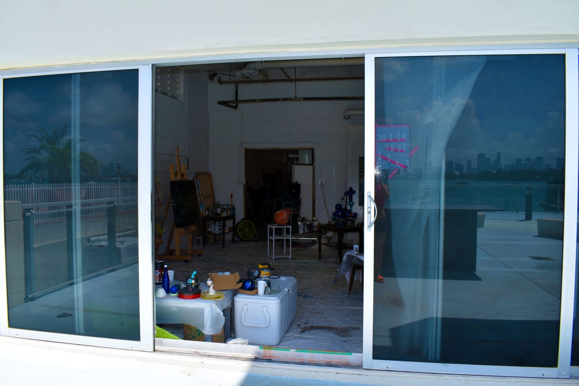Around 6pm, I return to the studio and am stunned by the sunset of Biscayne Bay. Every day is fantastic. I have a wall of frosted floor-to-ceiling sliding glass doors, but I need my privacy. It is incredible to be grappling with aesthetic decisions and nuances and then step out to the wonderment of the ever-changing, moody sunset vista. I think it makes sense for artists to look for those unused, "undesirable" spaces that exist in recent construction, often in the building's bowels.