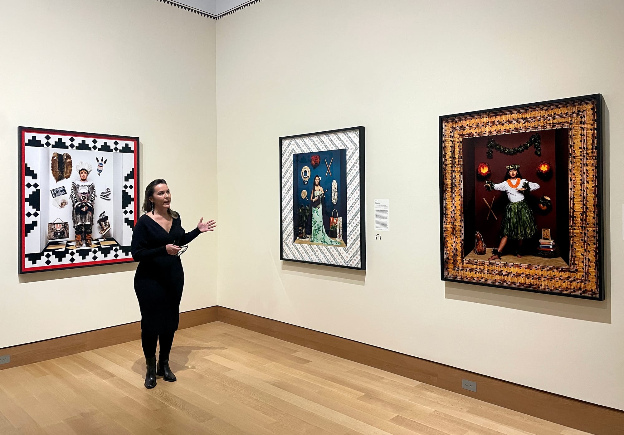 HANOVER, New Hampshire — A young Kānaka Maoli (Native Hawaiian) woman, Amedée Niamh Kauakohemālamalama Conley-Kapoi, gazes at her audience with calm resolution. Holding a poised hula stance, she leans to one side, arms extended parallel to the ground. Her expression radiates determination and an unyielding presence. She is surrounded by hula implements, some of which are her own. A leaf lei hangs above her, while a stack of books on Kānaka Maoli history and culture from Dartmouth College’s library sits neatly in the lower right corner of the thick border that frames her. This work, “Amedée” (2024), is part of Cara Romero’s (Chemehuevi) First American Doll portrait series depicting Indigenous people. Collaborators rather than mere models for the artist, her subjects actively shape their own representation, selecting the box’s designs, as well as their clothing and the objects that surround them. In “Amedée,” the box’s border features a kapa (Kānaka Maoli barkcloth painting) design created by Lehuauakea, a Kānaka Maoli interdisciplinary artist and kapa maker.