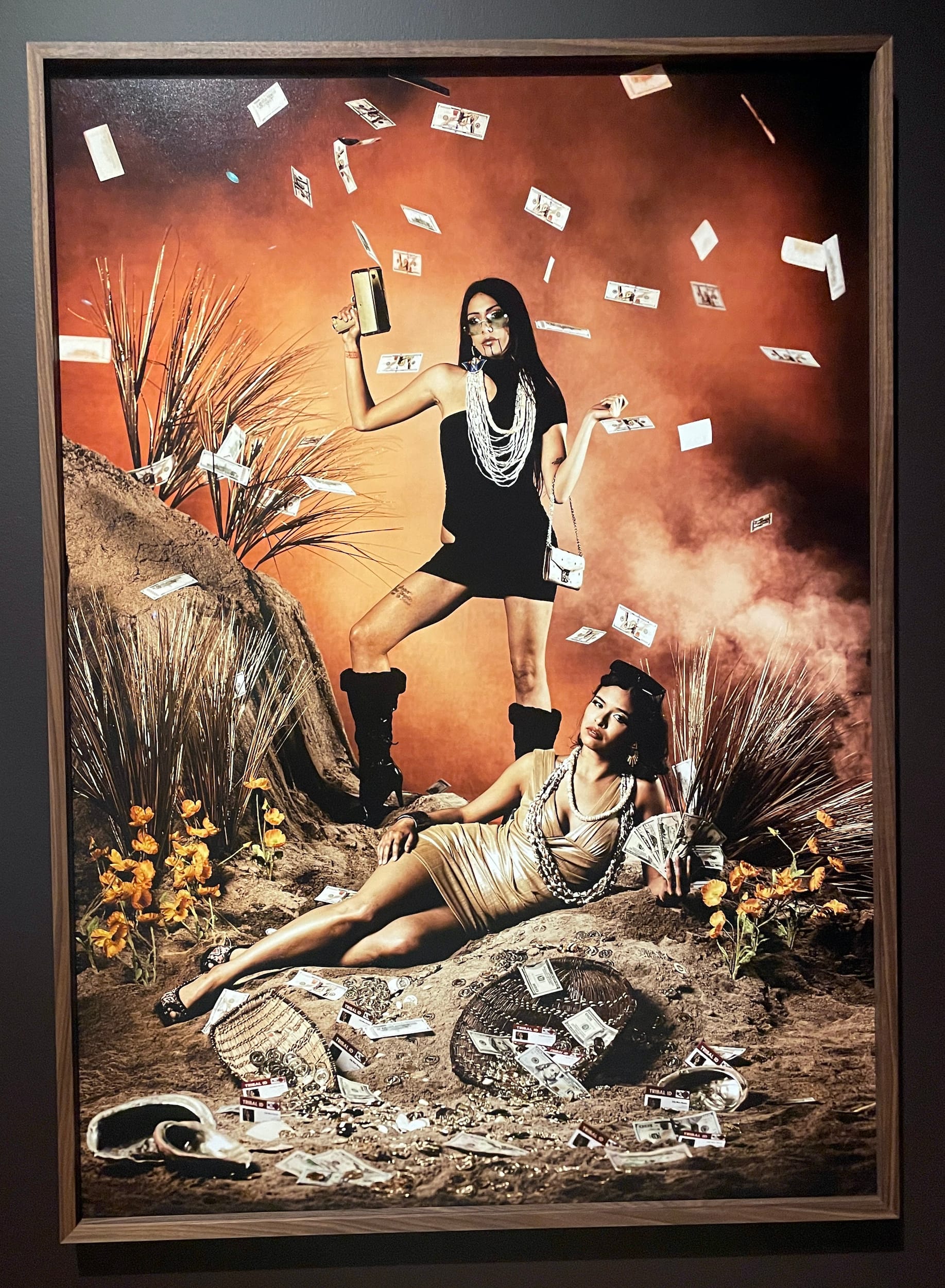 Through photography, Romero confronts the medium’s exploitative history, in which Native people were frequently objectified rather than understood. Her art also confronts the enduring colonial legacies embedded in institutions like Dartmouth. A standout piece in the show, “Cali Gold” (2024) from the Native California series, depicts two young Native women — Crickett Tiger (Muscogee Creek/Cochiti), Romero’s daughter, and Naomi Whitehorse (Northern Chumash and Sicangu Lakota), daughter of Romero’s frequent collaborator Leah Mata Fragua (Northern Chumash) — dressed in glamorous attire: heels, sunglasses, and necklaces linked to Native California regalia. Their styling suggests they’re preparing for a night out at the casino, yet they’re situated in a staged desert scene, surrounded by billowing smoke. Whitehorse, adorned with a traditional Native Californian chin tattoo, wields a money gun, while Tiger reclines on the ground, fanning out a wad of cash. They’re surrounded by items that link past and present: gold coins, cash, tribal ID cards, and baskets. The label accompanying “Cali Gold" addresses the California Gold Rush of 1848, which brought devastating violence, disease, and displacement to Native communities. It also points to the rise of tribal casinos and gaming over the past 50 years, a phenomenon both celebrated and debated within Native discourse. In this photograph, the women reclaim histories of hardship and division through their commanding poses, confident expressions, and defiant presence. Their identity as the next generation imbues the work with a sense of hope. Romero offers a striking rematriation of power — one where young women assert themselves within a Native California landscape deeply entangled with capitalism.