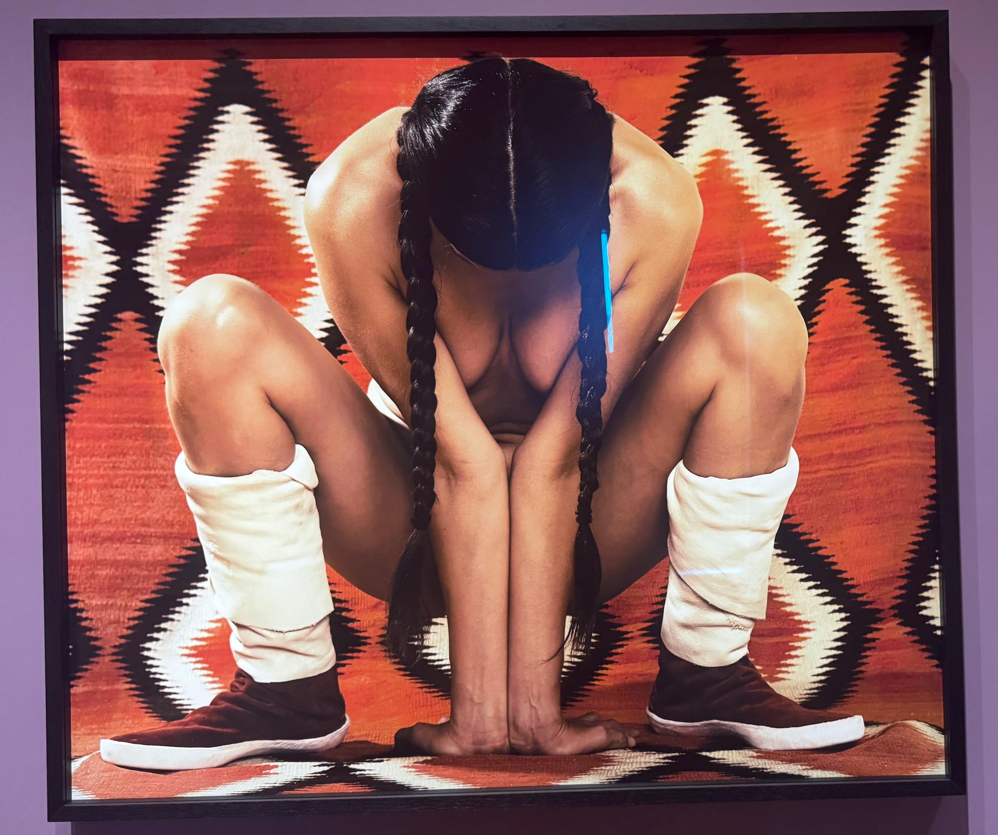 This piece, along with three other photographs featuring Kānaka Maoli women who attend Dartmouth (“Kaitlyn,” “Ha'ina 'ia mai,” and “Teani and Hope," all 2024), is part of Romero’s first major solo show, Cara Romero: Panûpünüwügai (Living Light), at Dartmouth College’s Hood Museum of Art. The exhibition’s setting at a higher education institution feels especially fitting: Romero discovered her passion for photography as an undergraduate at the University of Houston. Spanning 63 works created between 2013 and 2025, the show thoroughly explores Romero’s artistic practice, foregrounding her sensitivity to details and subjects. Each thoughtfully composed vision reflects her dedication to sharing stories from an Indigenous perspective. Using striking sets and commanding poses and styling — including empowered examples of nudity in “Nikki” (2014), “Kaa” (2017), and “Peshawn” (2022) — she centers Native identities, imaginations, and histories.