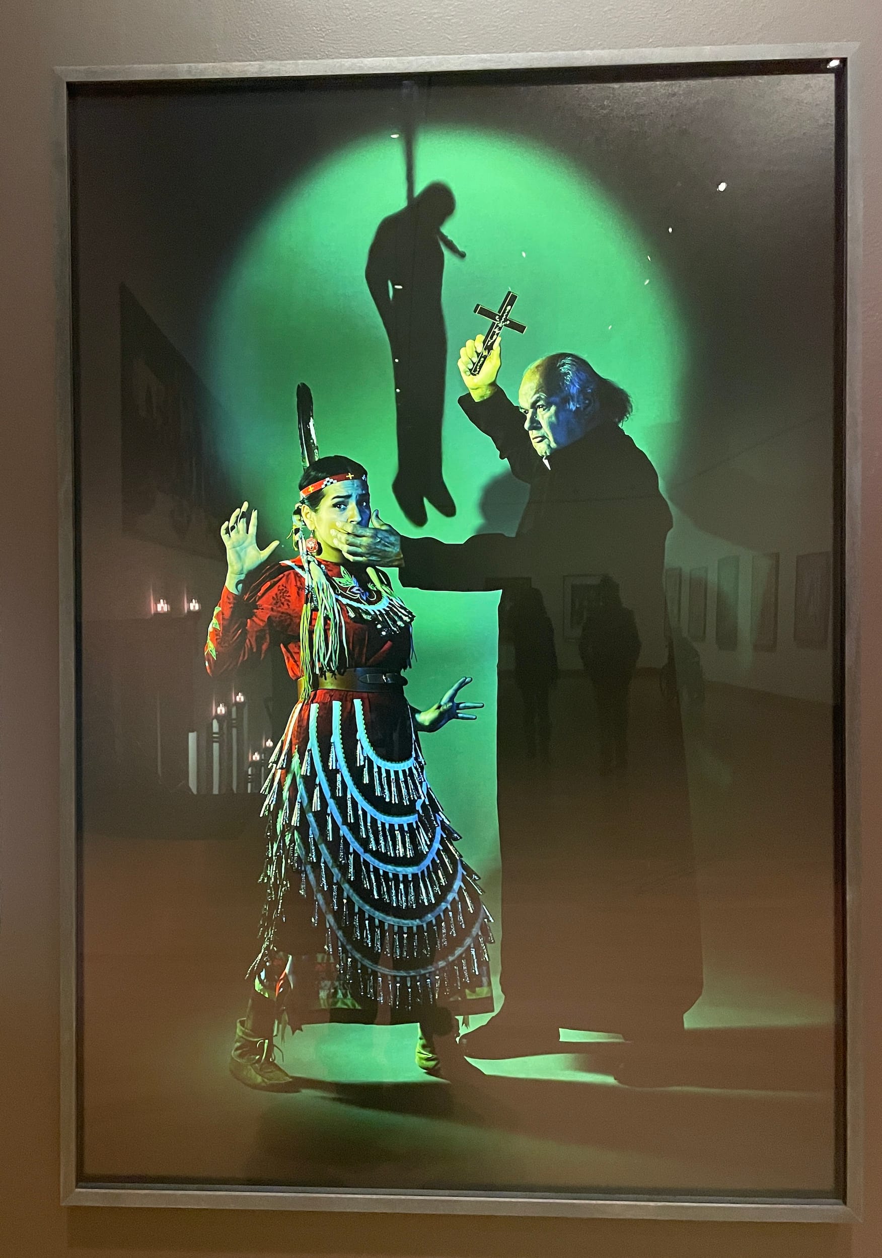 This more pointed lens extends to “Don’t Tell” (2021), but the power dynamics are far different. The photograph portrays Gary Farmer (Cayuga), a notable Native actor, posed as a Catholic priest holding a cross while covering a Native woman’s mouth, with the shadow of a hanging figure looming in the background. Romero’s decision to cast Farmer as a colonial figure adds another layer of complexity, challenging expectations around identity and historical roles. Casting a well-known Native actor as the priest may prompt Native audiences to recognize a familiar face, complicating the binary of oppressor and oppressed. It could also suggest how colonial violence has been internalized within Native communities. In diverse ways, “Cali Gold”and “Don’t Tell" exemplify Romero’s bold, unapologetic approach to historical trauma and colonial oppression. In doing so, her work challenges the predominantly White gaze that has long shaped photographic representations of these histories. By centering Native perspectives, Romero not only reclaims visual sovereignty but also asserts a powerful photographic existence that reflects Indigenous agency and critique.