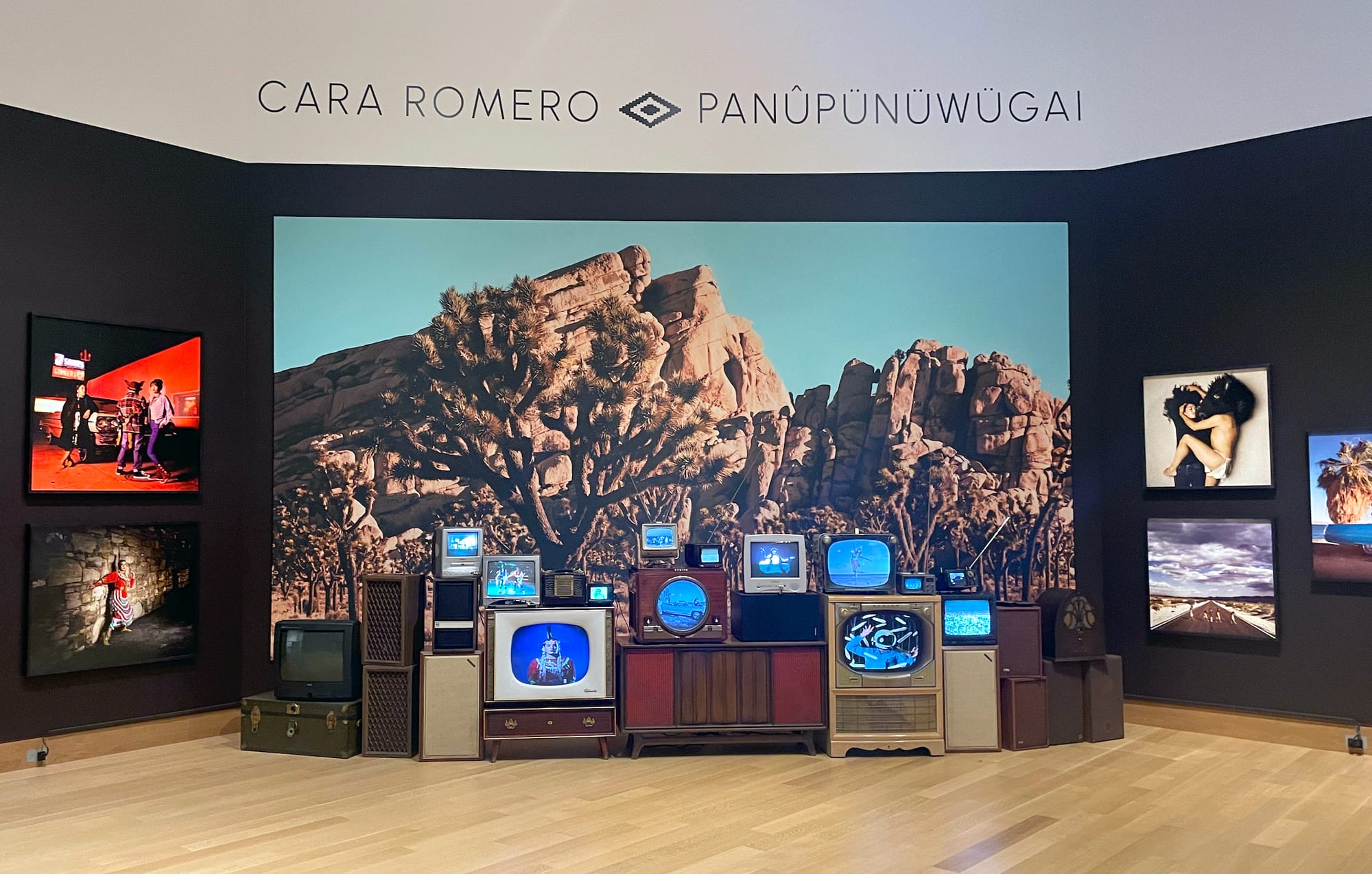The exhibition takes viewers through Romero’s vision of the universe. The stories she tells are shaped by her connections to her Chemehuevi homelands in the Mojave Desert and other Indigenous women, as well as the American cultural landscape, natural resource extraction on tribal lands, and Indigenous futures. Women and children, often the most vulnerable members of Native communities, are central to her work, particularly young Chemehuevi boys — her nephews — who appear throughout her imagery as playful mythological figures. Her monumental photographs — many human scale or larger, such as “The Last Indian Market” (2015), a reimagining of Leonardo da Vinci’s “The Last Supper” — alongside major installations inspired by the dramatic photographs “TV Indians” (2017) and “The Zenith” (2022), transform the exhibition into a immersive experience, almost as if her subjects were present and interacting with visitors.