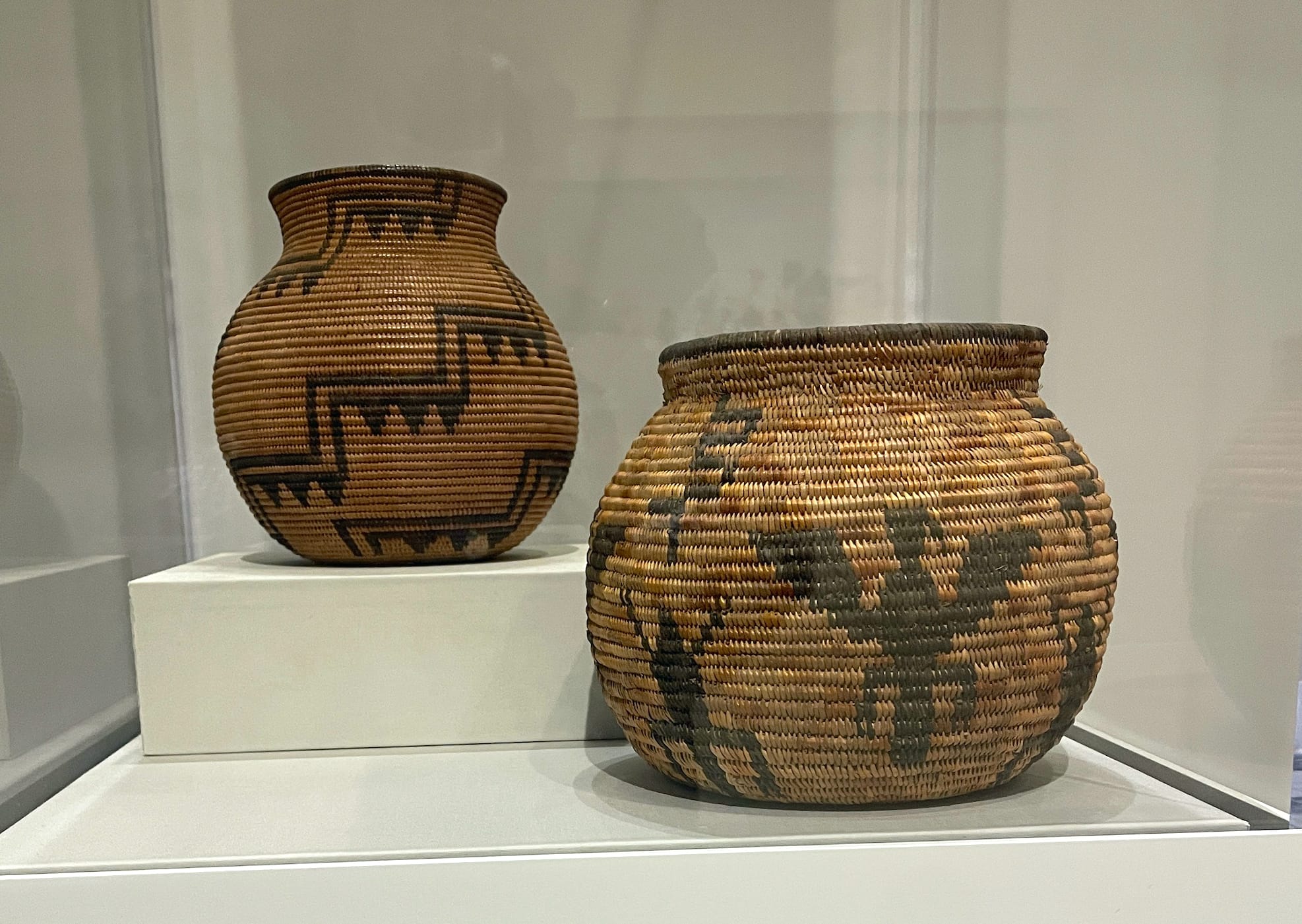 Romero’s work is preceded by a room featuring pieces by the prolific Chemehuevi basket weaver Mary Snyder (1852–1951) alongside five baskets labeled as the work of a “Chemehuevi artist once known,” some drawn from Romero’s personal collection. By including Snyder’s work together with these unnamed historical pieces from the early 20th century, the exhibition honors the legacy of Chemehuevi basket weavers, likely women, who came before Romero. She carries forth her ancestors’ artistry, presenting her work as part of an unbroken lineage and a testament to the enduring strength of Chemehuevi female creativity.