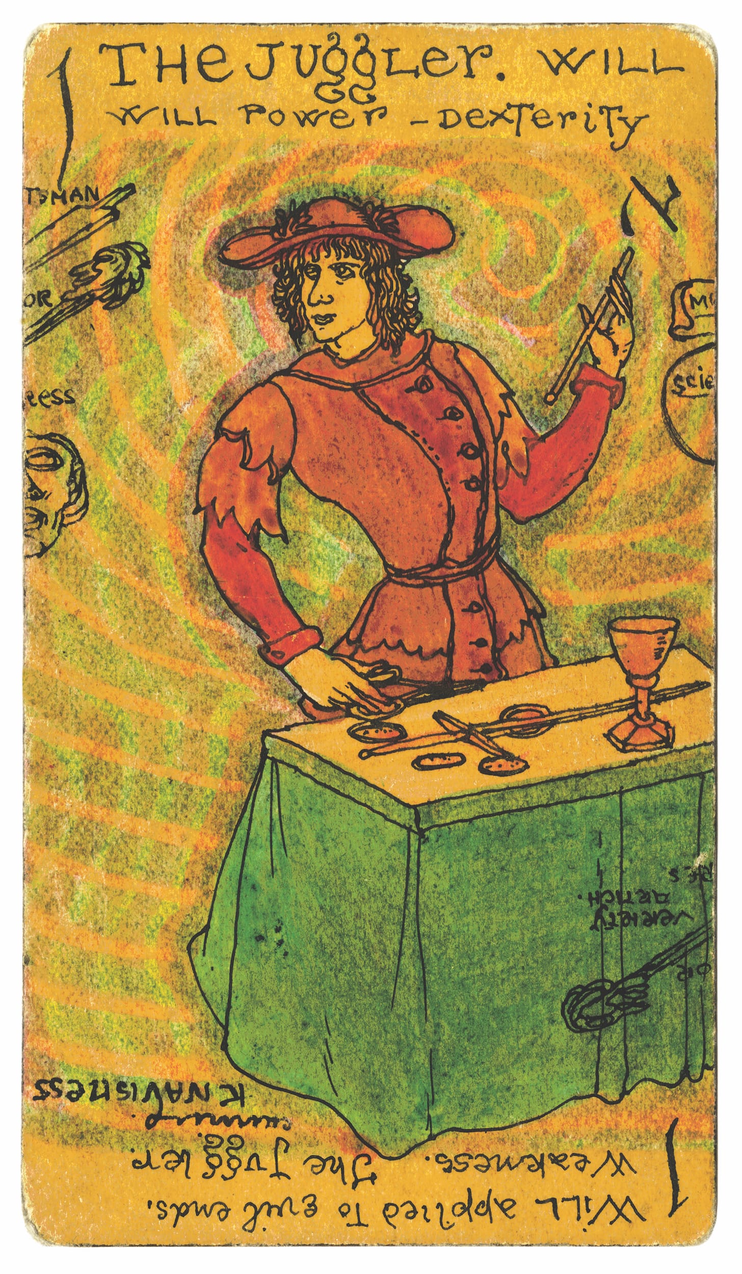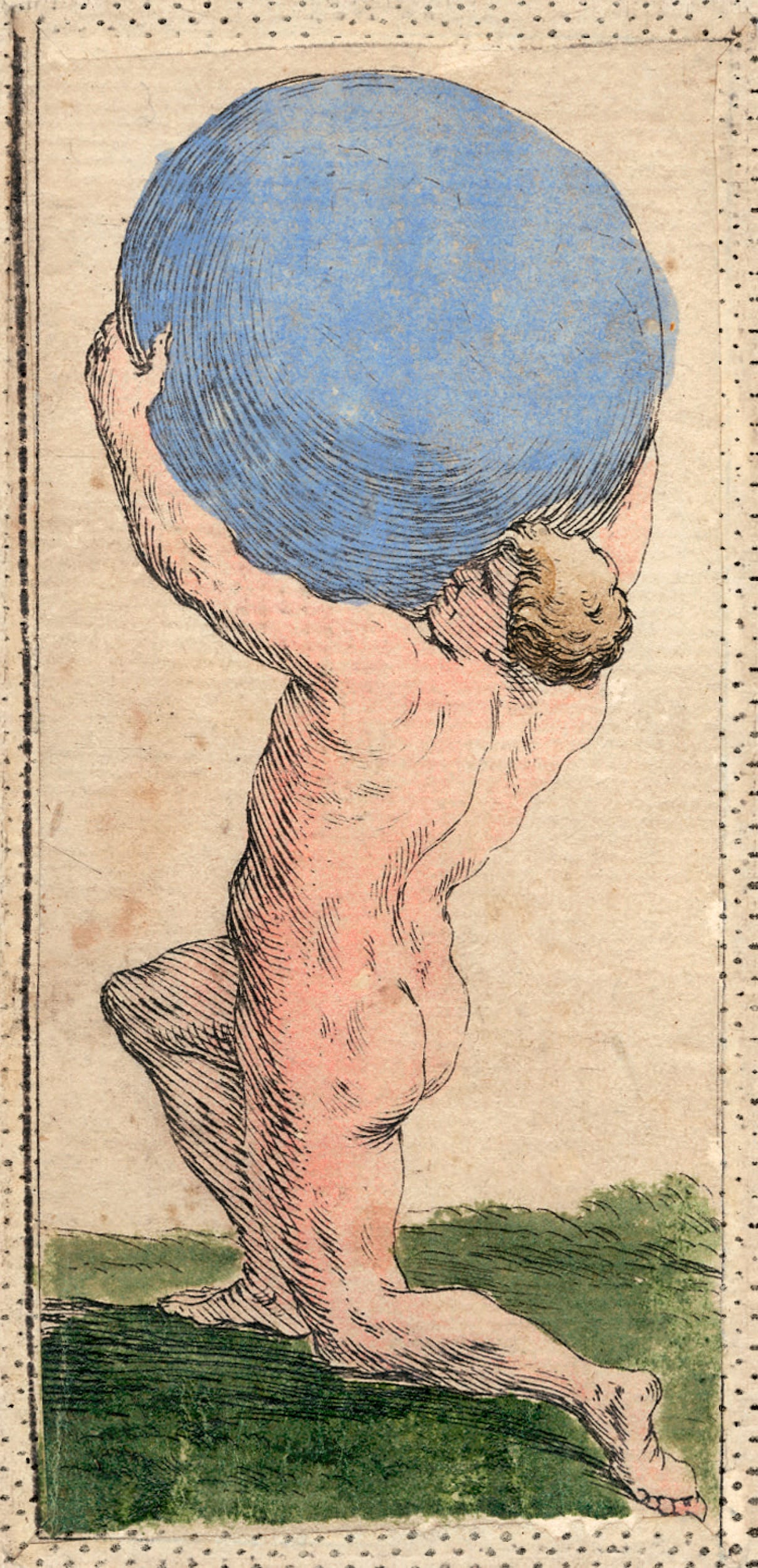 The curators politely declined my invitation for them to give a reading during our interview — they noted that they’re scholars and not practitioners — but they did share two cards that they love: "The World” from Tarocchino Mitelli (1660) and “The Juggler” from the Austin Osman Spare tarot deck (1906). While “The Juggler” does not appear in most contemporary tarot decks I’ve seen, it visually resembles "The Magician" from the Rider-Waite-Smith deck, while the 17th-century Tarocchino Mitelli card recalls the legendary image of the Greek Titan Atlas.