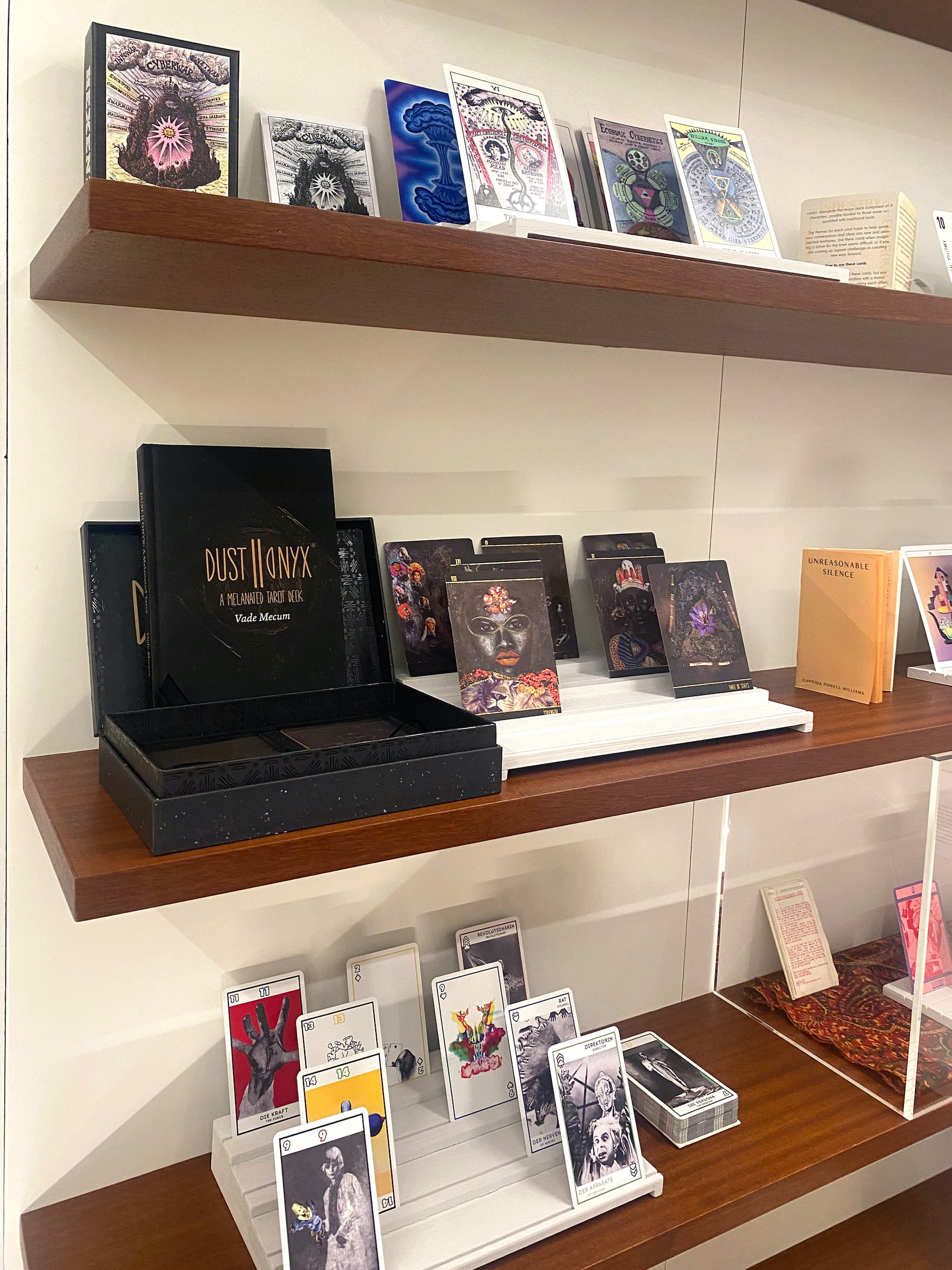 The exhibition also dives into a major historical turning point in the history of tarot. In the 1780s, French Freemason and scholar Antoine Court Gébelin declared that it “was not a mere pack of playing cards,” the exhibition text states, “but a repository of arcane wisdom known as the ‘Book of Thoth,’ originating in Ancient Egypt.” Other fascinating items are notions of tarot as a “story machine,” through a novel by Italo Calvino in which the characters can only communicate with tarot cards, and Suzanne Treister’s famous HEXEN 2.0 and HEXEN 5.0 decks, which help orient us to alternative futures; a full view of the popular Rider-Waite-Smith deck, illustrated by Pamela Colman Smith; and a Tarotkammer, a collection of contemporary decks inspired by the Renaissance-era Wunderkammer, or cabinet of curiosities.