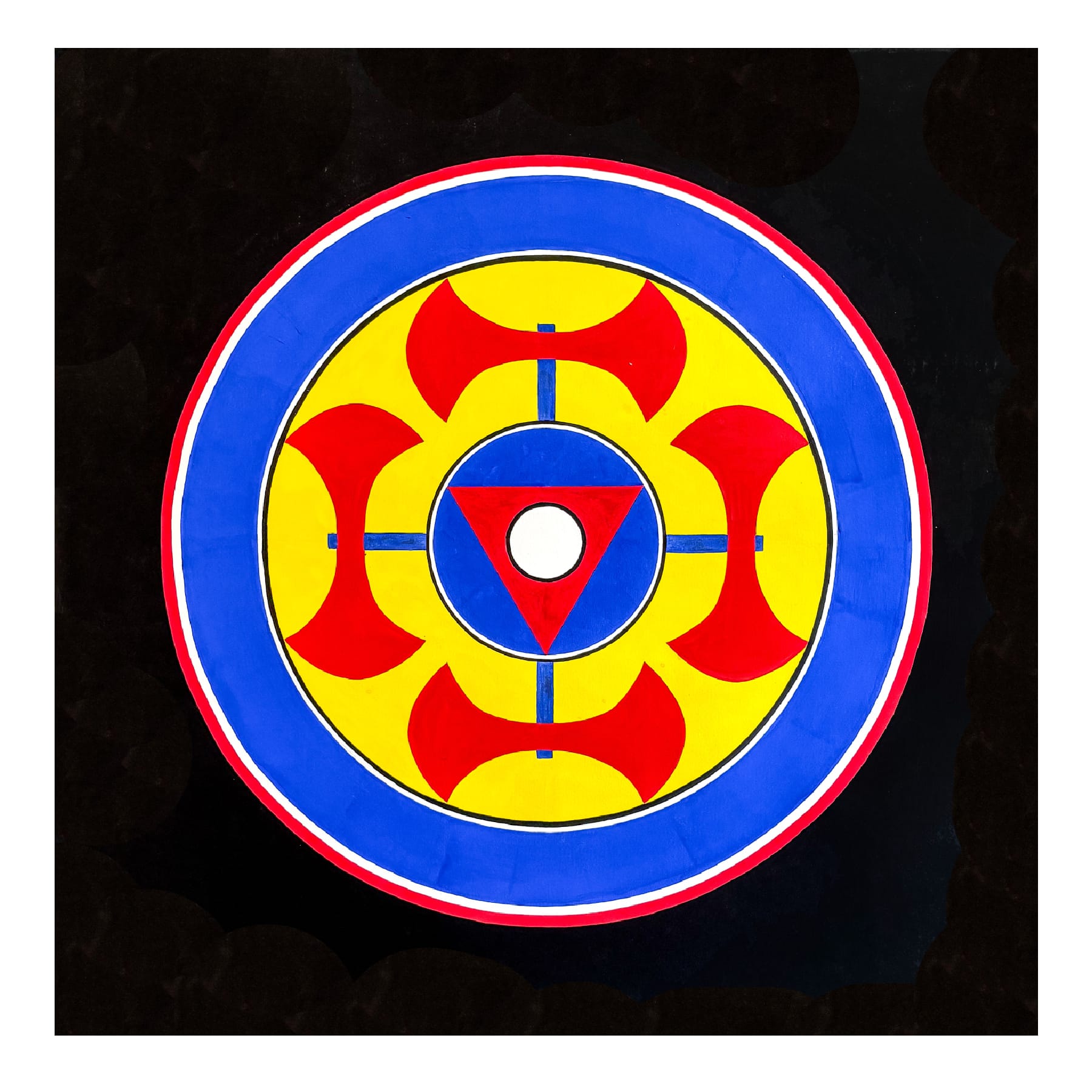 The late Bruce Cahn was "socially disinterested" as a youth, according to the press release, and declined to exhibit his art during his lifetime. After studying at Bard College and the Arts Student League, he worked obsessively in a small apartment in Manhattan before adopting Woodstock as his hometown. Woodstock Work at Opus 40 in Saugerties presents a series of gouache on paper works that reflect Cahn’s esoteric flair and his affinity for sacred geometries. His undivided creative focus comes through in “Blue Eye Mandala” (2016), featuring a blue circle with a white slit at the center set against a black background, and a crimson triangle with a small white circle embedded in its center appears within a cerulean sphere in “Red Triangle Mandala” (2016). While his “Four Axe Mandala” (2016) displays exquisite cross-fertilization between Buddhist and Native American imagery, his “Flower Mandala” (2016) is a blooming, layered vision of bright squares and circles that appear to rotate.