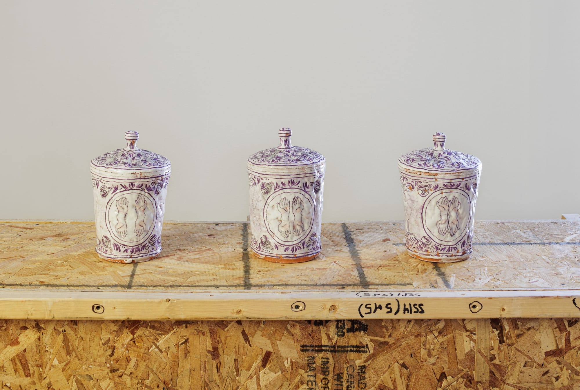 Combining colorful mounds of clay with decorative vessels to create dramatic organic shapes that border on ritual objects, Nicki Green’s earthenware style is an exciting vision of contemporary ceramics. Her first New York solo show Fruitful Vine, curated by Liz Munsell for the River Valley Arts Collective and staged in Al Held’s former drawing studio at the Al Held Foundation in Boiceville, presents a series of new sculptures created for the space plus an installation formerly commissioned by the Institute of Contemporary Art, Los Angeles. “Hybrid Vessel 11 (copper jar)” (all works 2025) and “Hybrid Vessel 10 (yellow double jars)” appear to ooze with glowing globs of amorphous clay that overtake their white jar containers, while her three “Tender Offering Jars” are stoic and stately. Greens references the "queering of figuration” and “trans embodiment” as core aspects of her creative practice, according to the press release; true to form, futuristic works such as “Hybrid Vessel 12 (blue jar)” seem to simultaneously contain and resist.