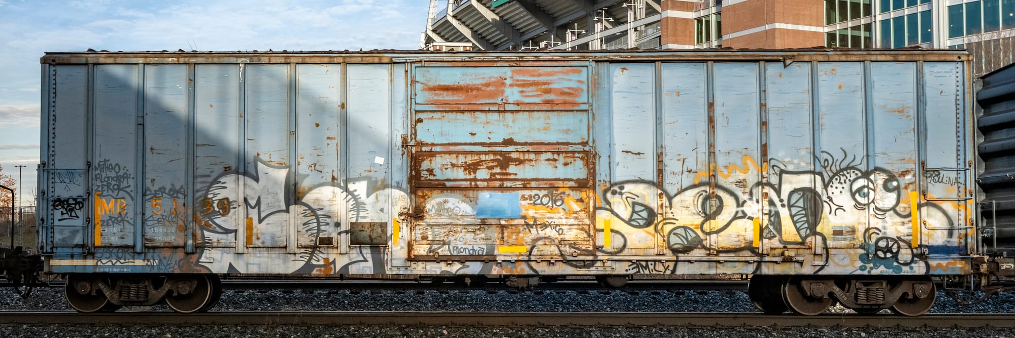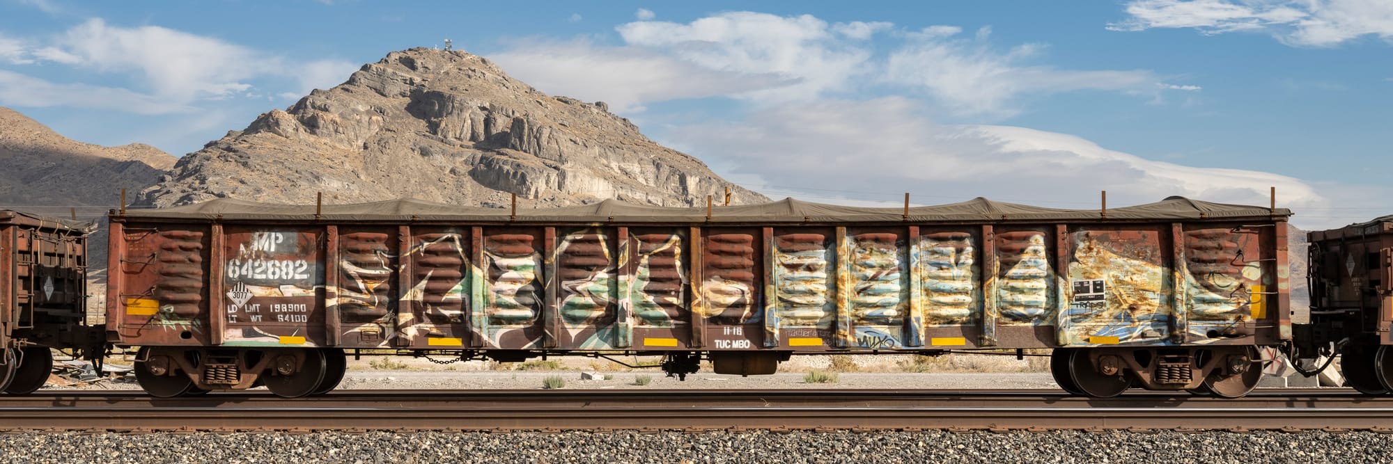 As our understanding of the United States changes with every day of the current administration, Passing America at Front Room Gallery in Hudson presents a series of powerful photos of train cars that seem to capture the emptiness of it all. Exploring the soiled beauty of raw industry and the aging glory of locomotive systems, Mallon’s images are an homage to trains and their enduring importance in this country. “Locomotive FEC 803” (all works 2024) includes a robust orange and yellow train set against an exciting pastel-colored Floridian backdrop, while “Centerbeam Flatcar TTZX 861740” shows the bare bones of a train car that has offloaded its goods as it musters along against dry flat land, mountains in the distance. And in photos such as “Boxcar ATW 173673” and “Gondola WFRX 914233,” we encounter rusty trains bombed with colorful graffiti. Mallon’s “Caboose UP 25807” is a portrait of a faded yellow Union Pacific train that embodies nostalgia for an American time gone by.
