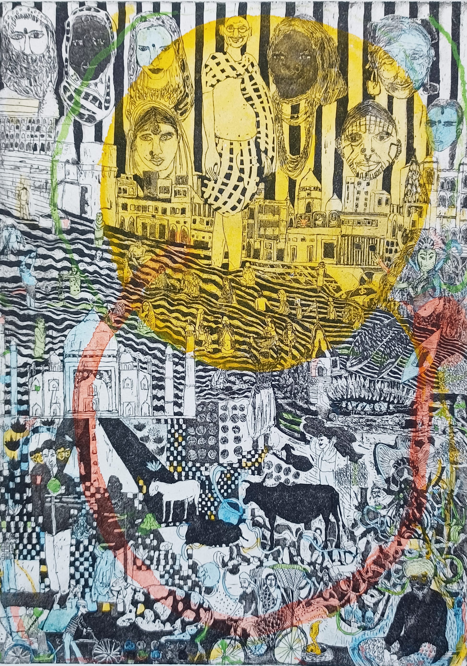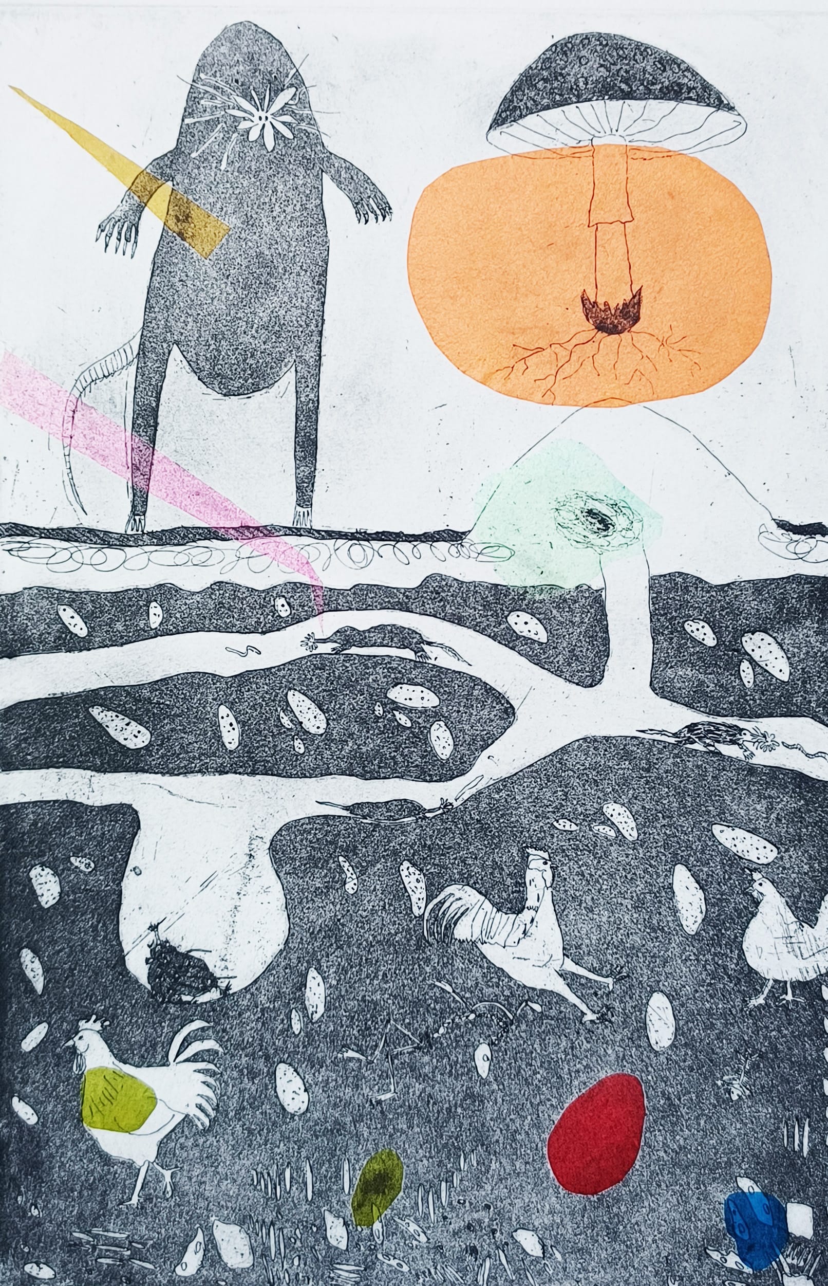 Joanna Grabiarz’s artistic universe goes from a small plot of land with curious creatures roaming about to a blown-out scene of lively human mayhem. Her solo show at Green Kill in Kingston presents a series of older etchings that disclose the sheer delight of her practice. In “Life in Captivity” (2013), we encounter a blobby green being that hovers above three little octopuses in boxes — it feeds one of them while the second is plugged into some kind of technology, and a third rests blissfully. “Bingo” (2014) shows three Tarot-inspired cards side-by-side with titles such as "La Dama" featuring a naked female figure with a stylish mustache who unflinchingly severs her body in half and cuts off her limbs. “Fairy Tail” (2015) contains a diverse world within a single realm, complete with children picnicking among happy mini UFOs at the bottom, an urban chaos and random tree stumps in the middle, and Tai Chi practitioners at the top — all of it wild and wonderful.