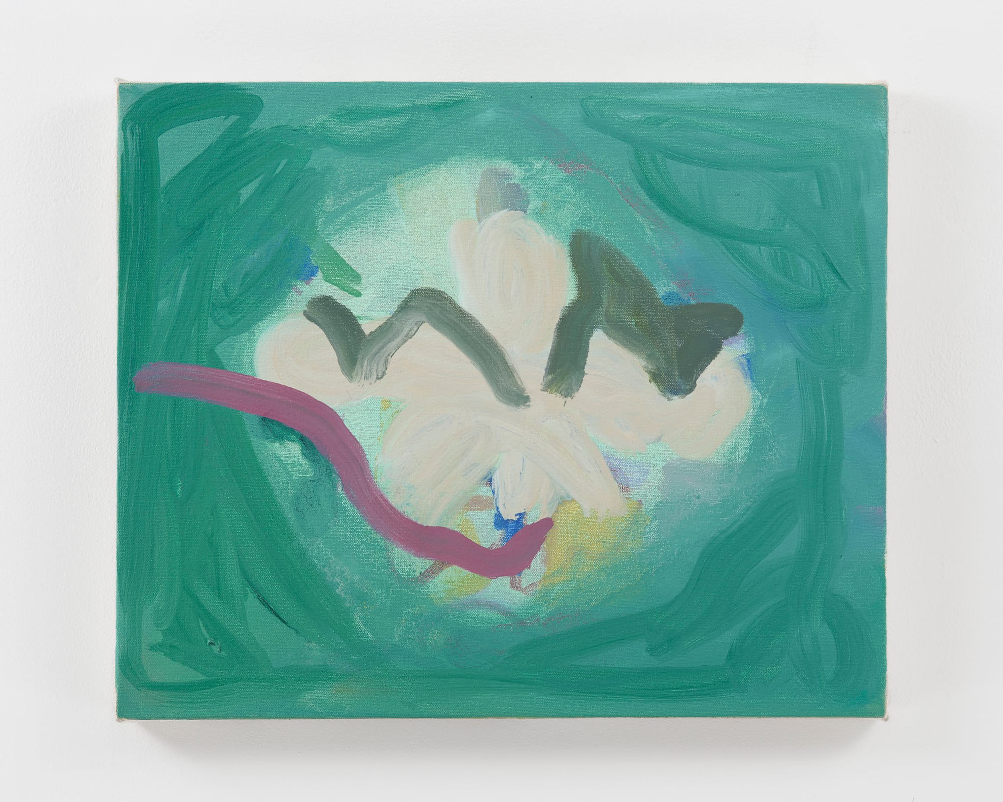 Abstraction as a movement is a yet unfinished project, one that consistently evolves in the most mysterious ways. Self-taught painter Peter Shear explores the boundless joys of abstract adventures in his first solo show A Point Between the Eyes at Mendes Wood DM in Germantown. We encounter Shear’s poetic paintings throughout the first floor and outer garage of this rustic old home converted into a sophisticated gallery space, and each piece invites us to explore the dreamlike trance induced by his gestures. Where “Memory Game” (2024) layers deep hues horizontally across the canvas, “Classic Car” (2025) is a solo green shape in the middle of an otherwise empty white background. The tone of “On this Day” (2023) is a wink at Rothko’s sublime style, and “Press” (2024), with its warm green field on all sides and organic contours that dance in the middle, is an elated painterly embodiment of the season.